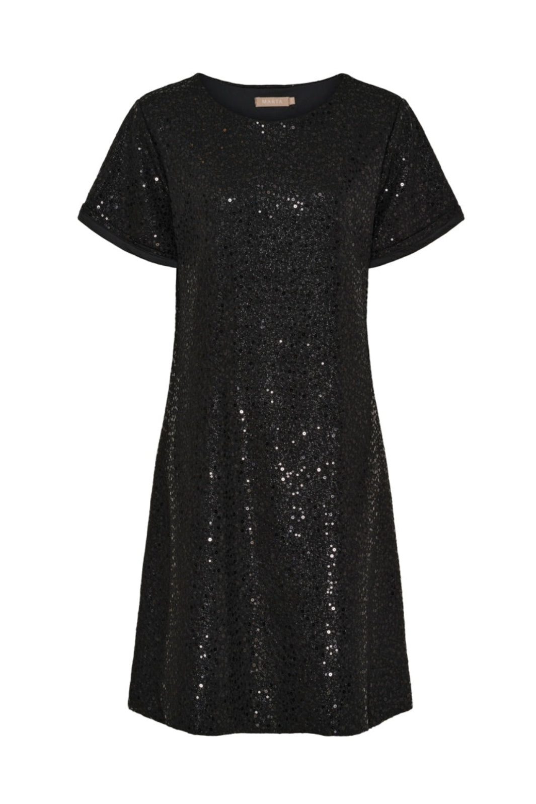 Zwarte jurk van Marta Du Chateau met pailletten over de hele jurk. Het korte model heeft een ronde hals en korte mouwen, waardoor het gemakkelijk te stylen is voor een feest.