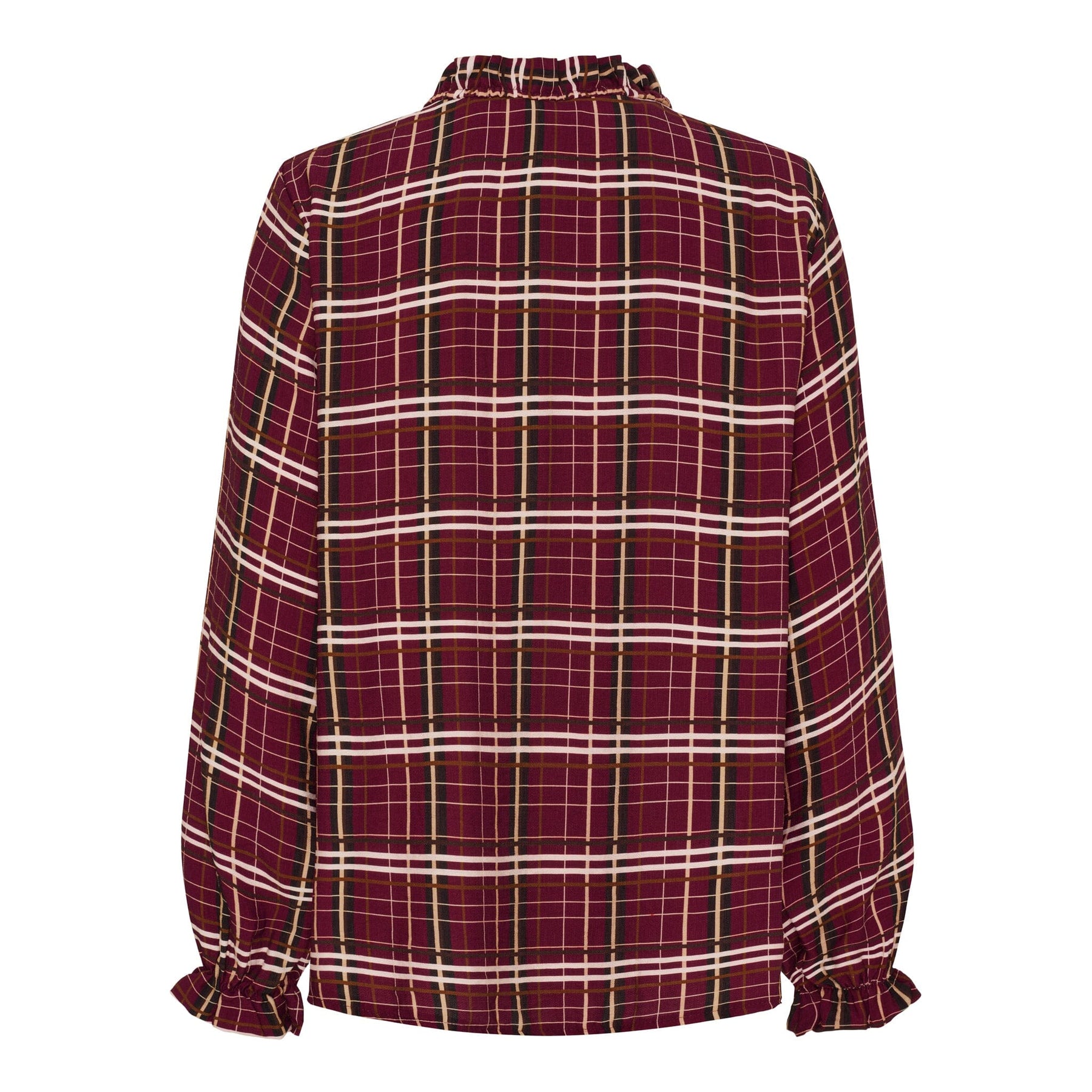 Bordeaux geruite blouse van Marta Du Chateau met witte strepen. De blouse heeft een knoopsluiting aan de voorkant en ruches bij de V-hals en manchetten.