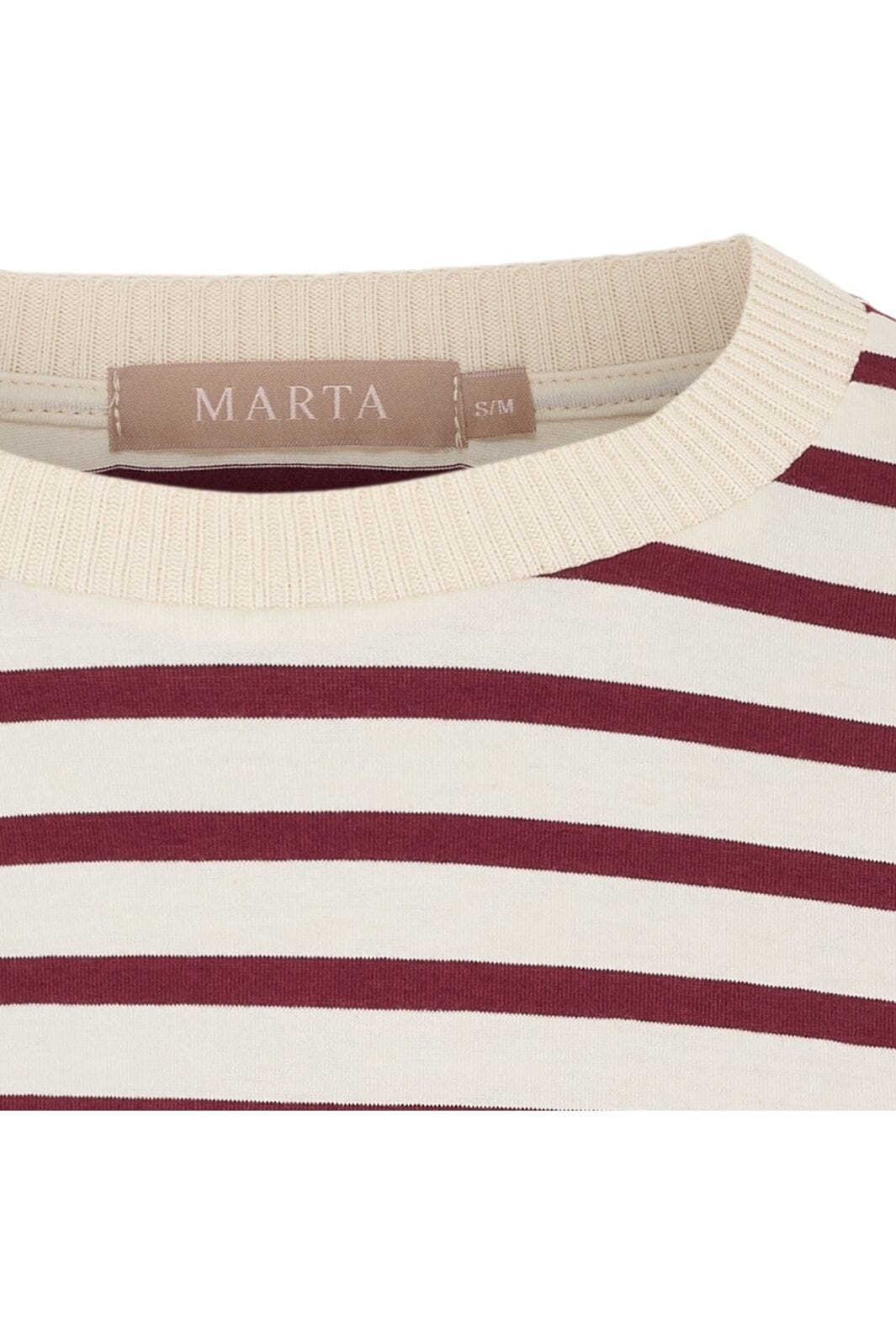 Gestreept T-shirt van Marta Du Chateau in beige en bordeaux. De T-shirt heeft een ronde halslijn en 3/4-mouwen met horizontale strepen rondom.