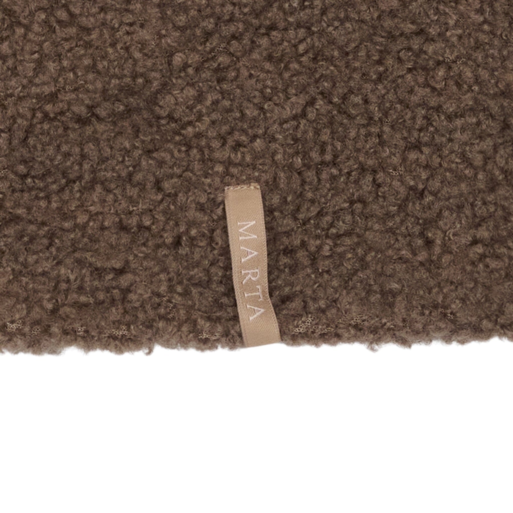 Bruine balaclava van Marta Du Chateau met een zachte teddy-textuur. Het bedekt je hoofd en hals met een open gezichtsgedeelte en heeft verstelbare koorden aan de voorkant.