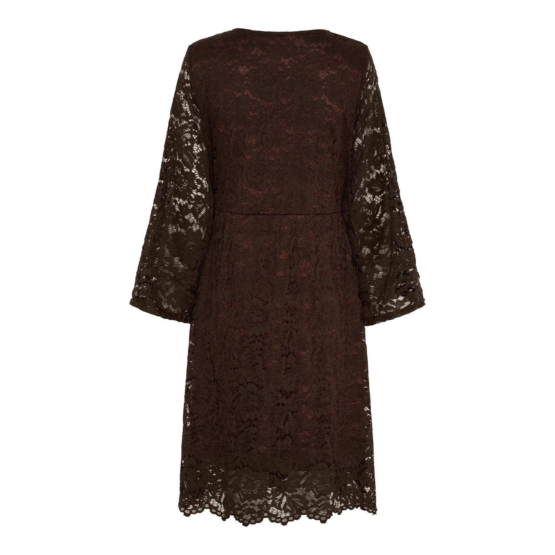 Bruine knielange jurk van Marta Du Chateau met kanten oppervlak. De jurk heeft een V-hals en 3/4-mouwen, evenals een strikband aan de zijkant die een slank silhouet geeft.