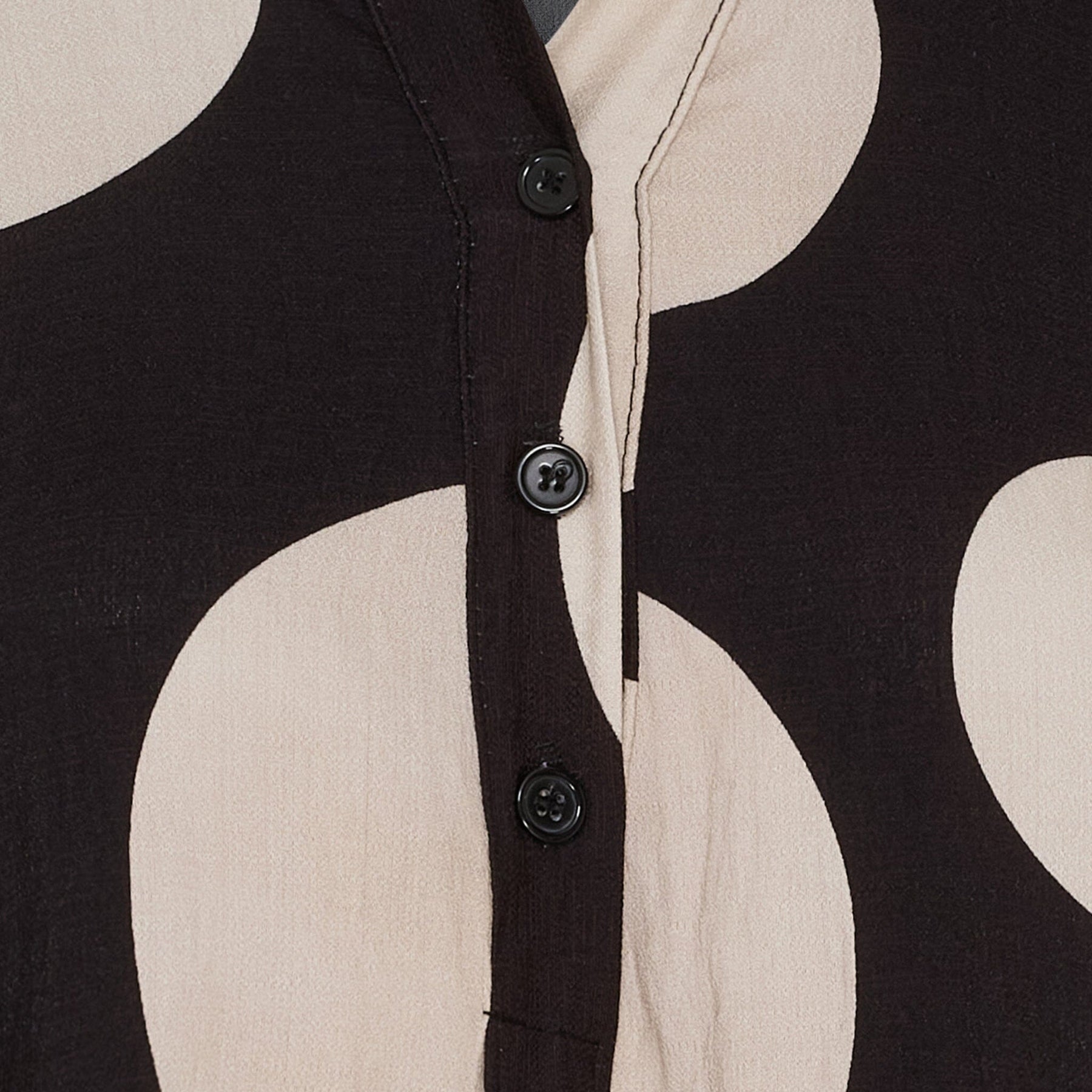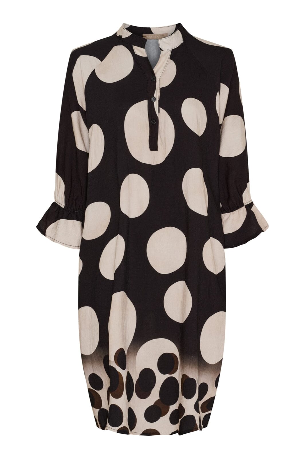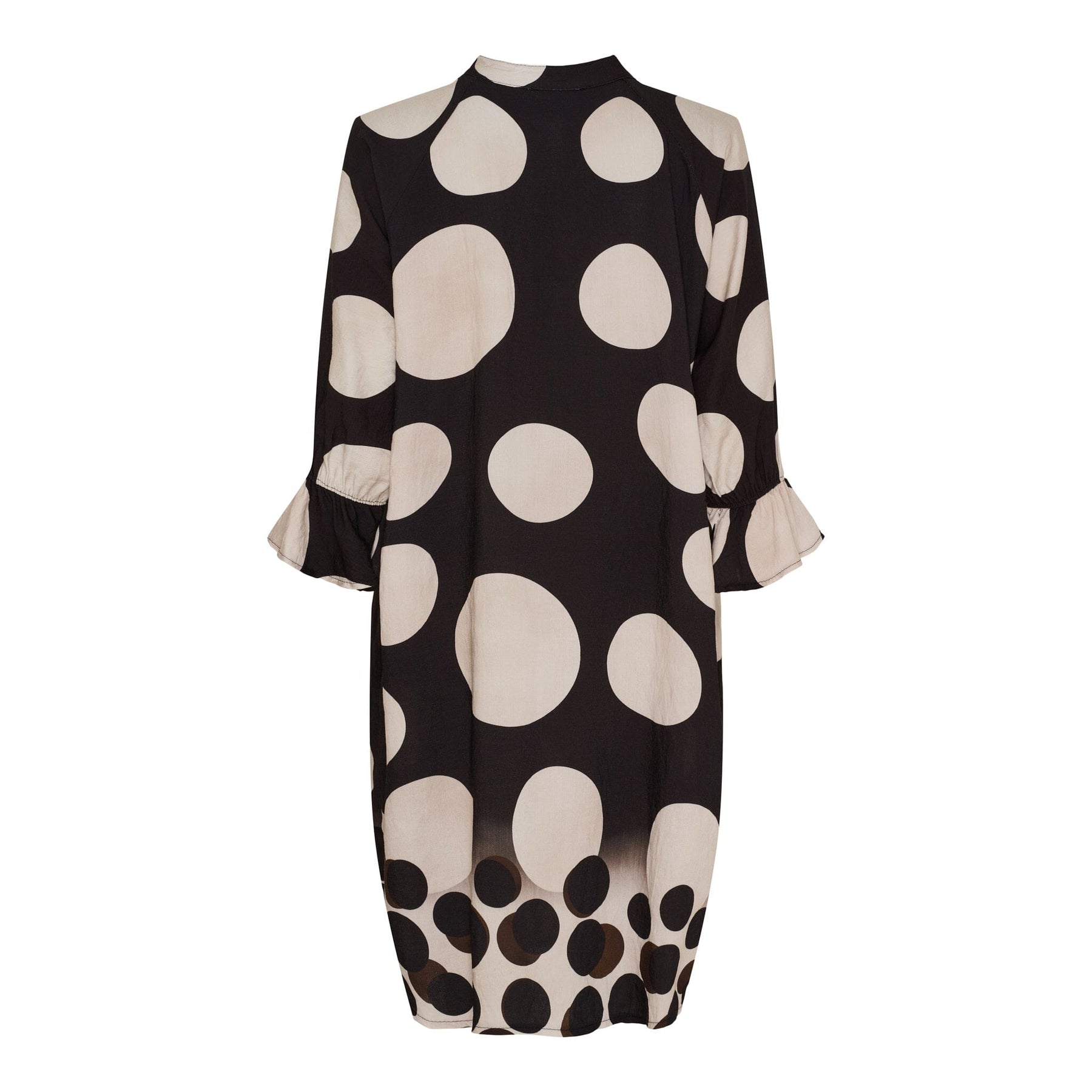Zwarte jurk van Marta Du Chateau met grote beige stippen. De jurk heeft een losse pasvorm en komt tot de knie. Hij is gemaakt met driekwart mouwen en een overhemdkraag met knopen.