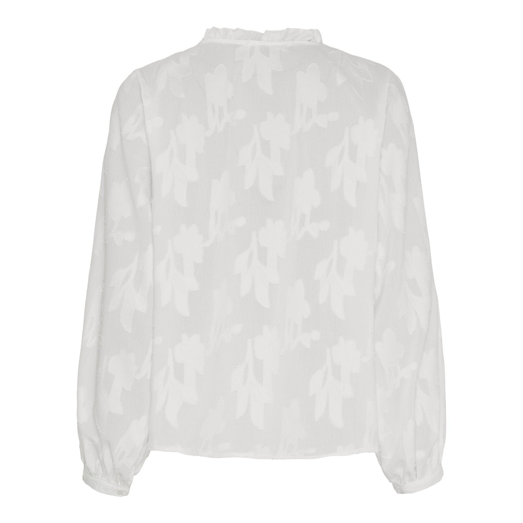 Witte blouse van Marta Du Chateau met een geborduurd bloemenpatroon. De blouse heeft ruches langs de voorkant en is gemaakt als een pullover zonder sluiting.