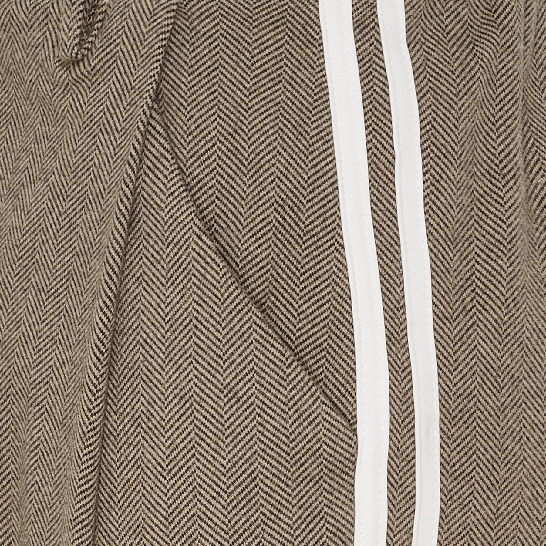 Bruine broeken van Marta Du Chateau met witte strepen langs de benen. De broeken hebben een losse pasvorm en komen tot halverwege de kuit. Ze hebben zowel een rits, elastiek als knopen in de taille.