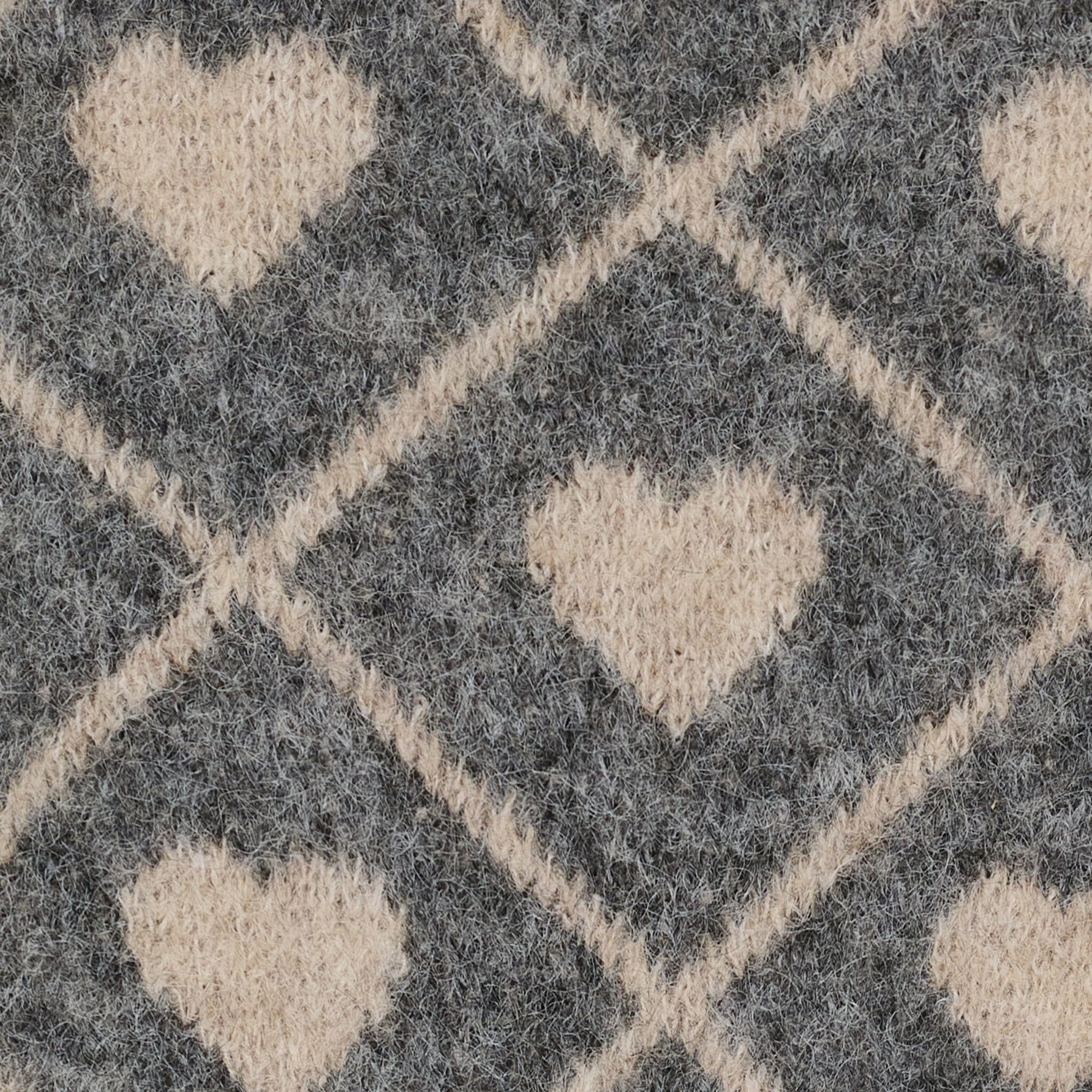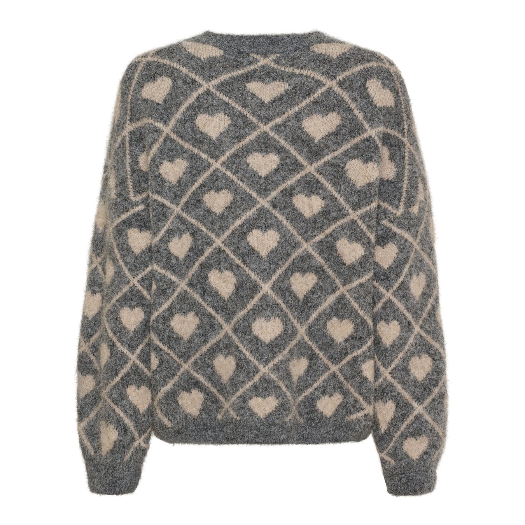 Grijze trui van Marta Du Chateau met beige harten en een diamantpatroon. De ronde halslijn en de lange mouwen geven de trui een klassieke vorm.