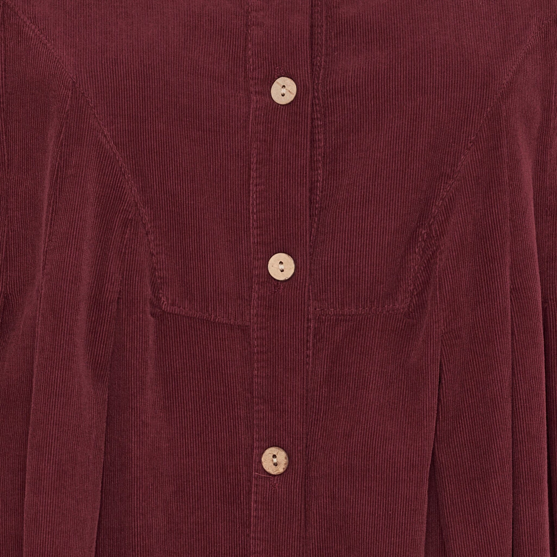 Bordeauxkleurige jurk van Marta Du Chateau in 100% katoen. De jurk heeft een overhemdkraag, knopen aan de voorkant en lange mouwen met brede manchetten. De losse pasvorm biedt veel bewegingsvrijheid.