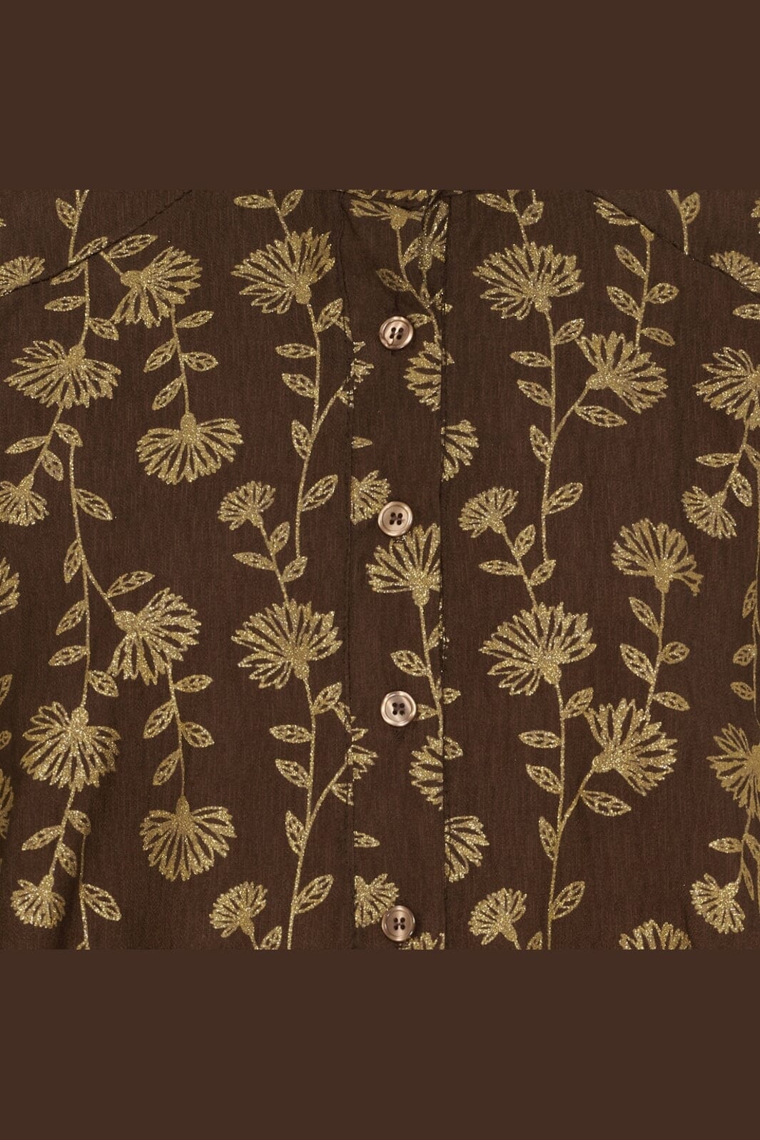 Bruine jurk van Marta Du Chateau met een gouden bloemenprint. De jurk heeft knopen over de hele lengte, een overhemdkraag en lange mouwen met elastiek bij de polsen.