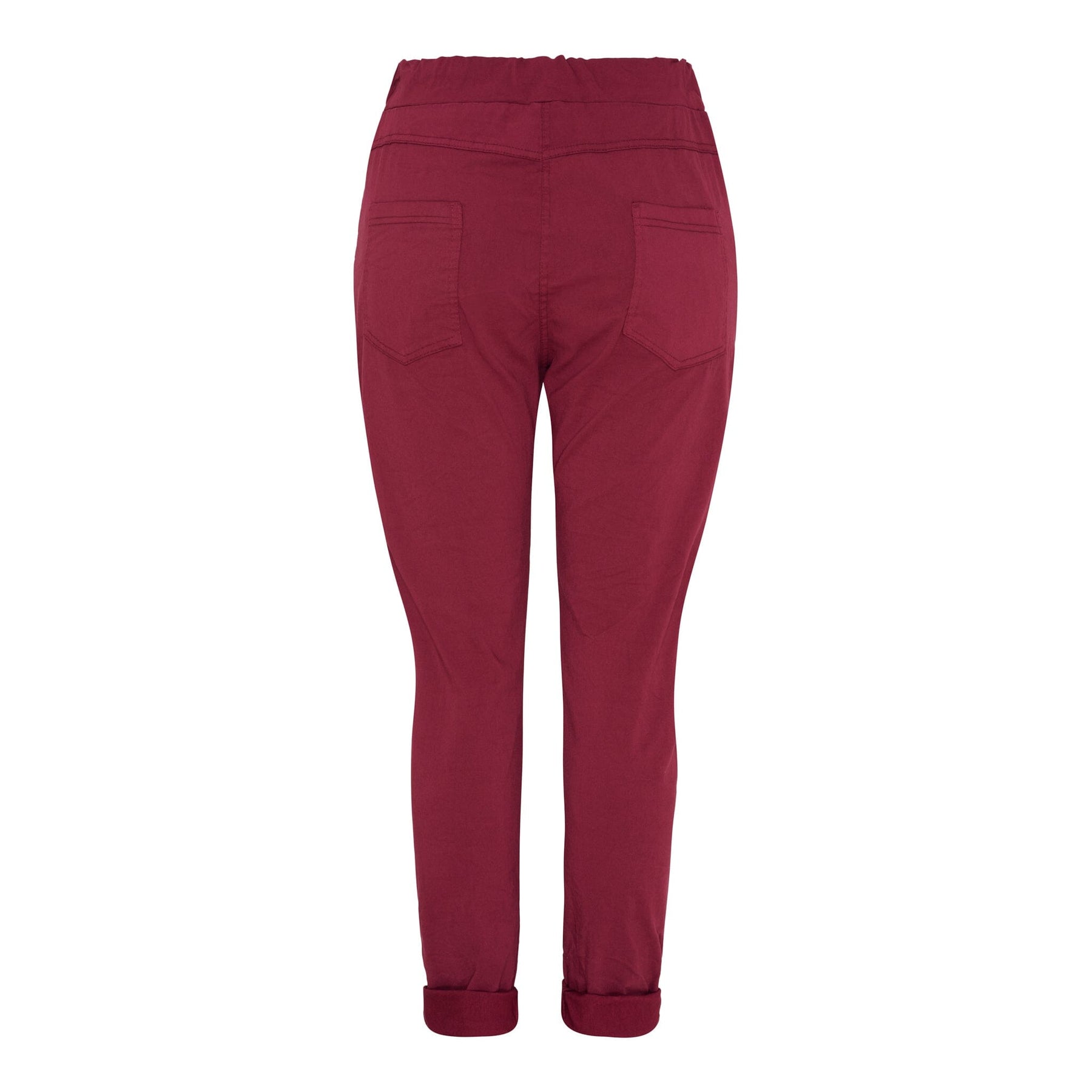 Bordeauxkleurige broek van Marta Du Chateau met een koord in de taille. De broek heeft een normale pasvorm en twee voorzakken. Ze zijn enkellang met omgeslagen broekspijpen.