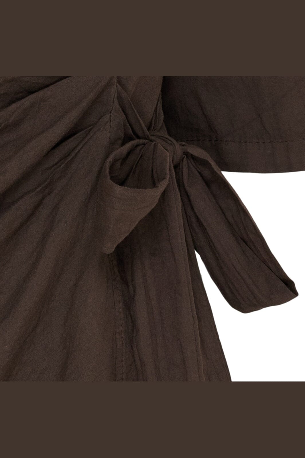 Bruine blouse van Marta Du Chateau in 100% katoen. De blouse heeft een asymmetrische onderkant en driekwart mouwen met een strikdetail aan de zijkant.