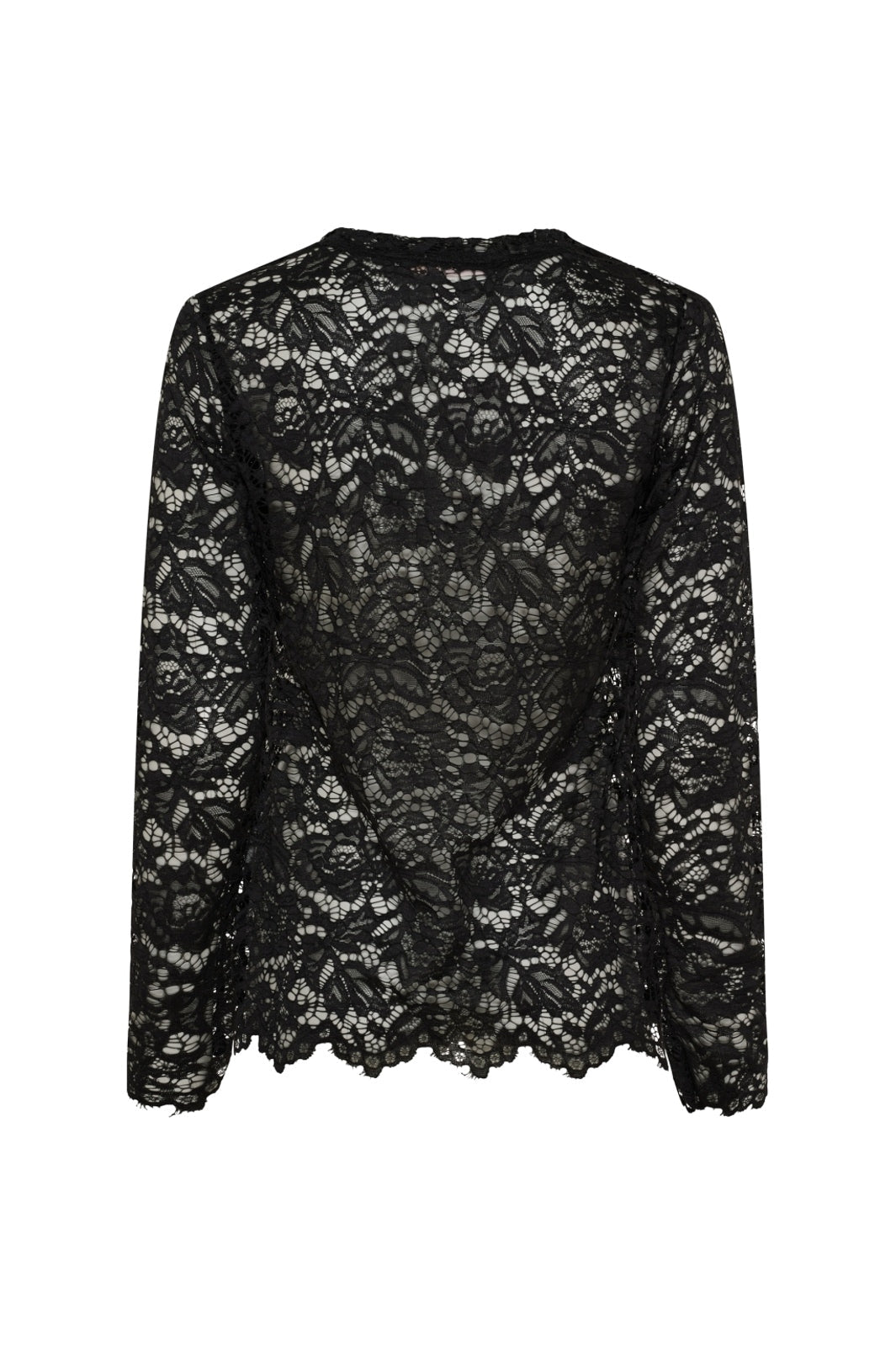 Zwarte kantenblouse van Marta Du Chateau met een bloemenpatroon. De blouse heeft een ronde halslijn en lange mouwen met kantdetails overal.