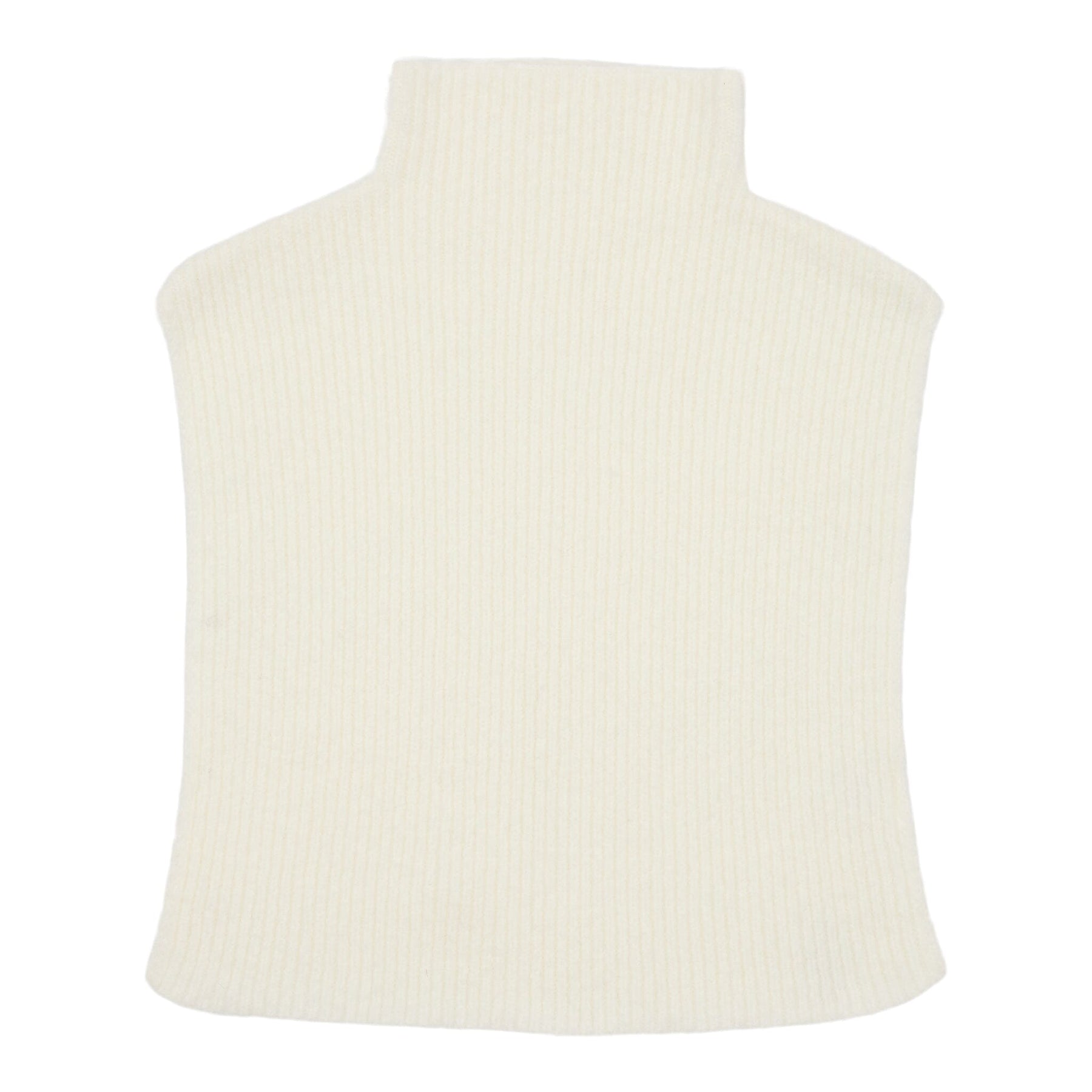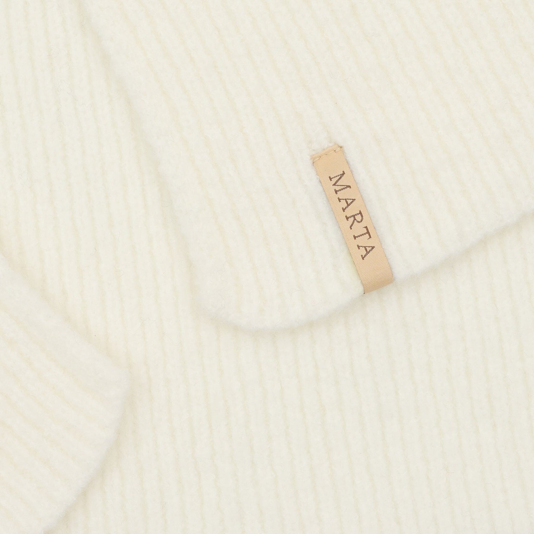 Witte sjaal van Marta Du Chateau met hoge kraag en ribgebreid ontwerp. De sjaal heeft een neutrale offwhite kleur en een goede structuur die warmte rond de hals biedt.