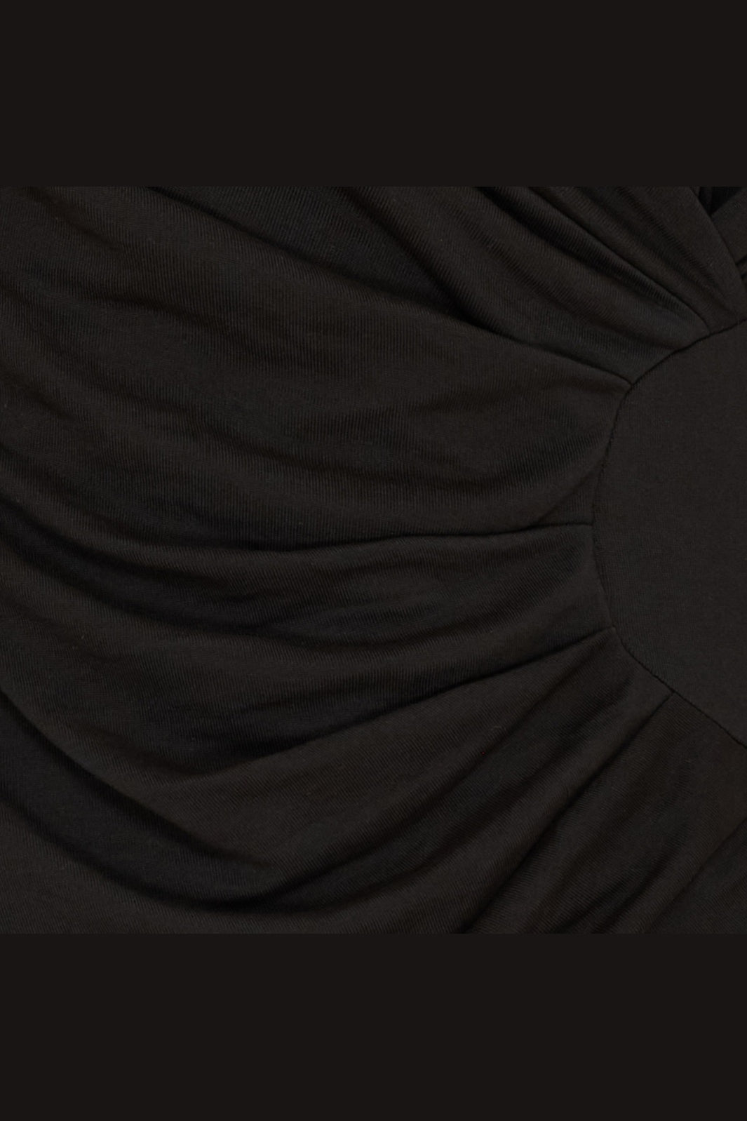 Zwarte blouse van Marta Du Chateau met omslag-effect. De blouse heeft plooien aan de voorkant en een V-halslijn die zorgt voor een zachte val.