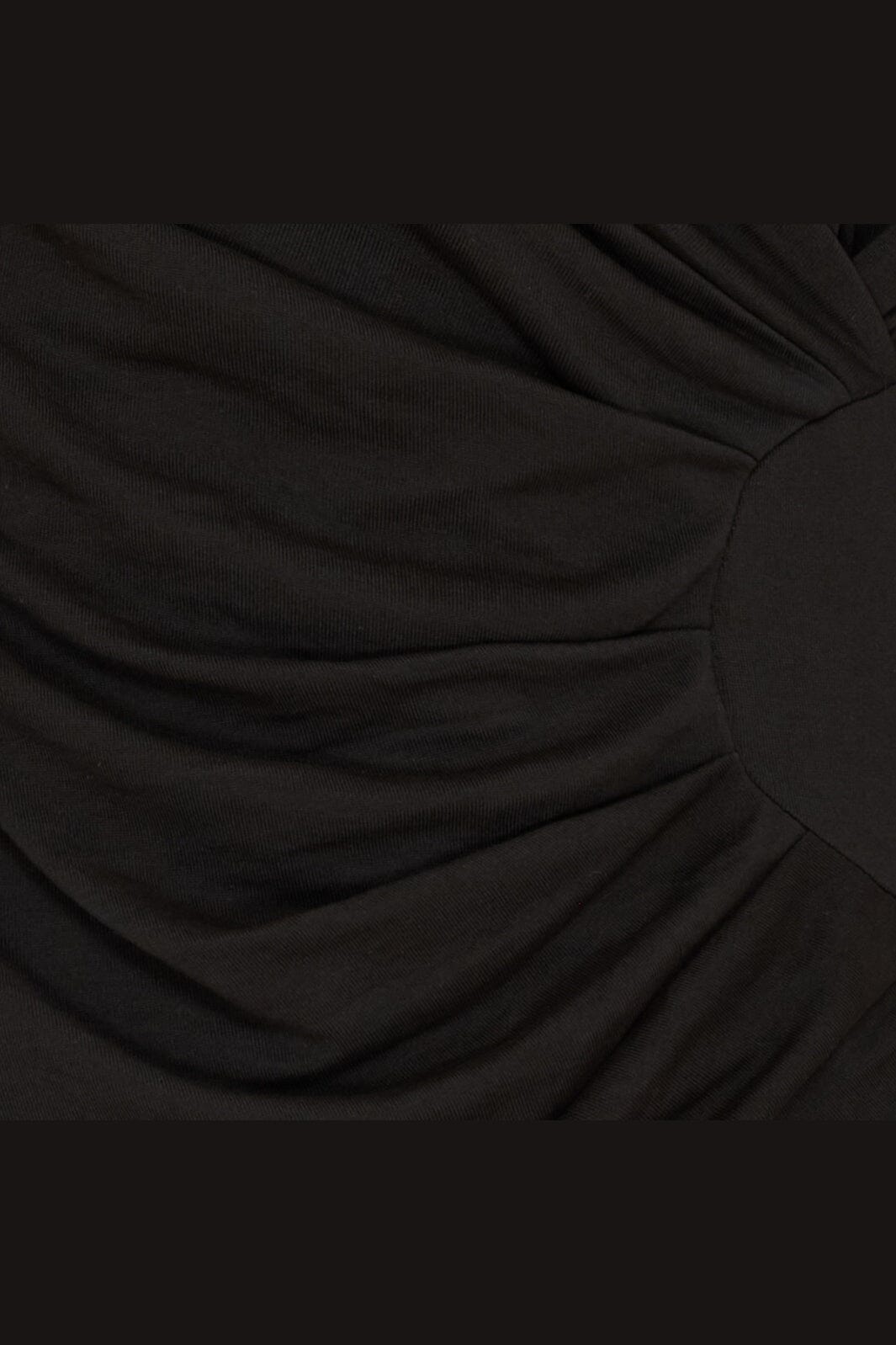 Zwarte blouse van Marta Du Chateau met een wikkel-effect. De blouse heeft plooien aan de voorkant en een V-hals die zorgt voor een zachte val.