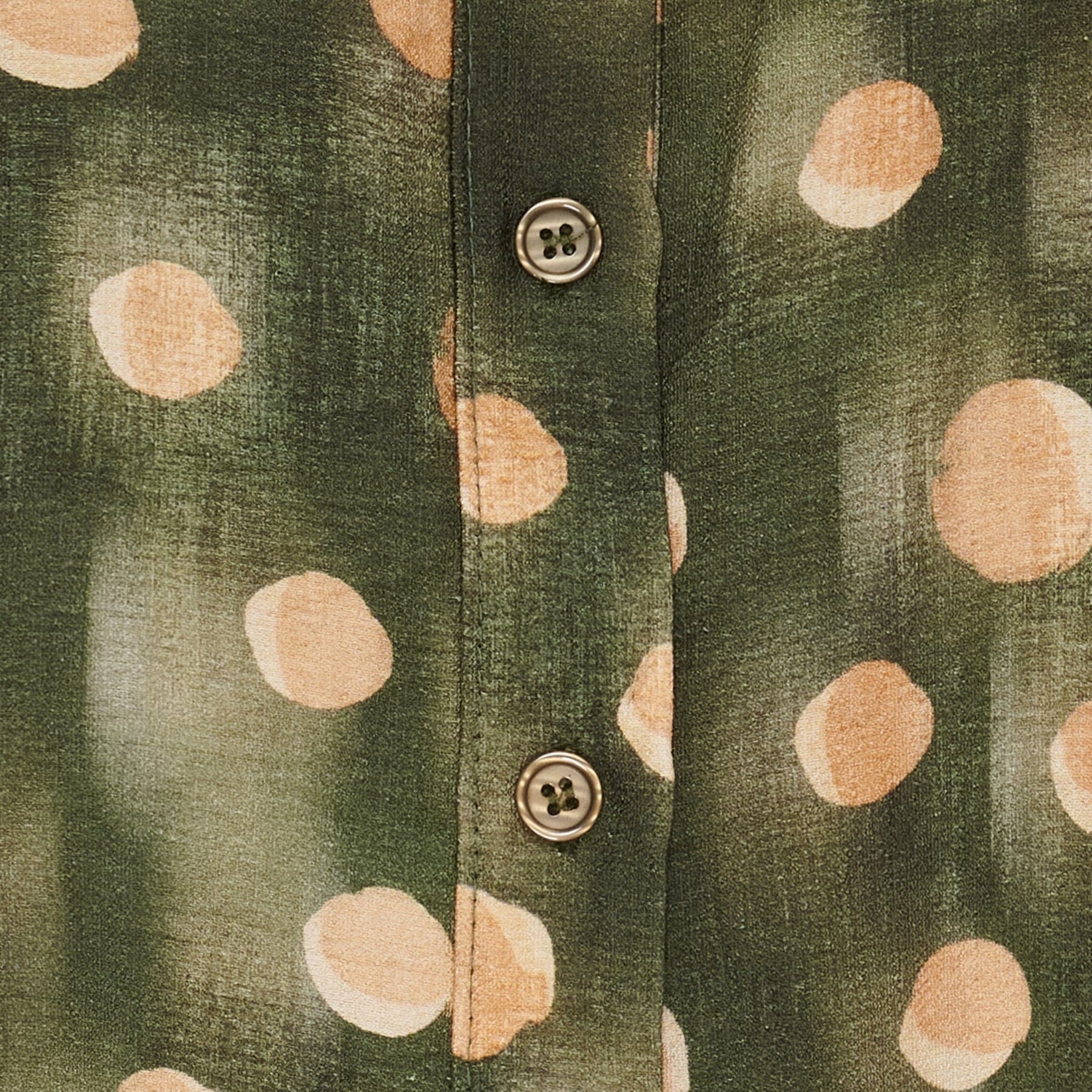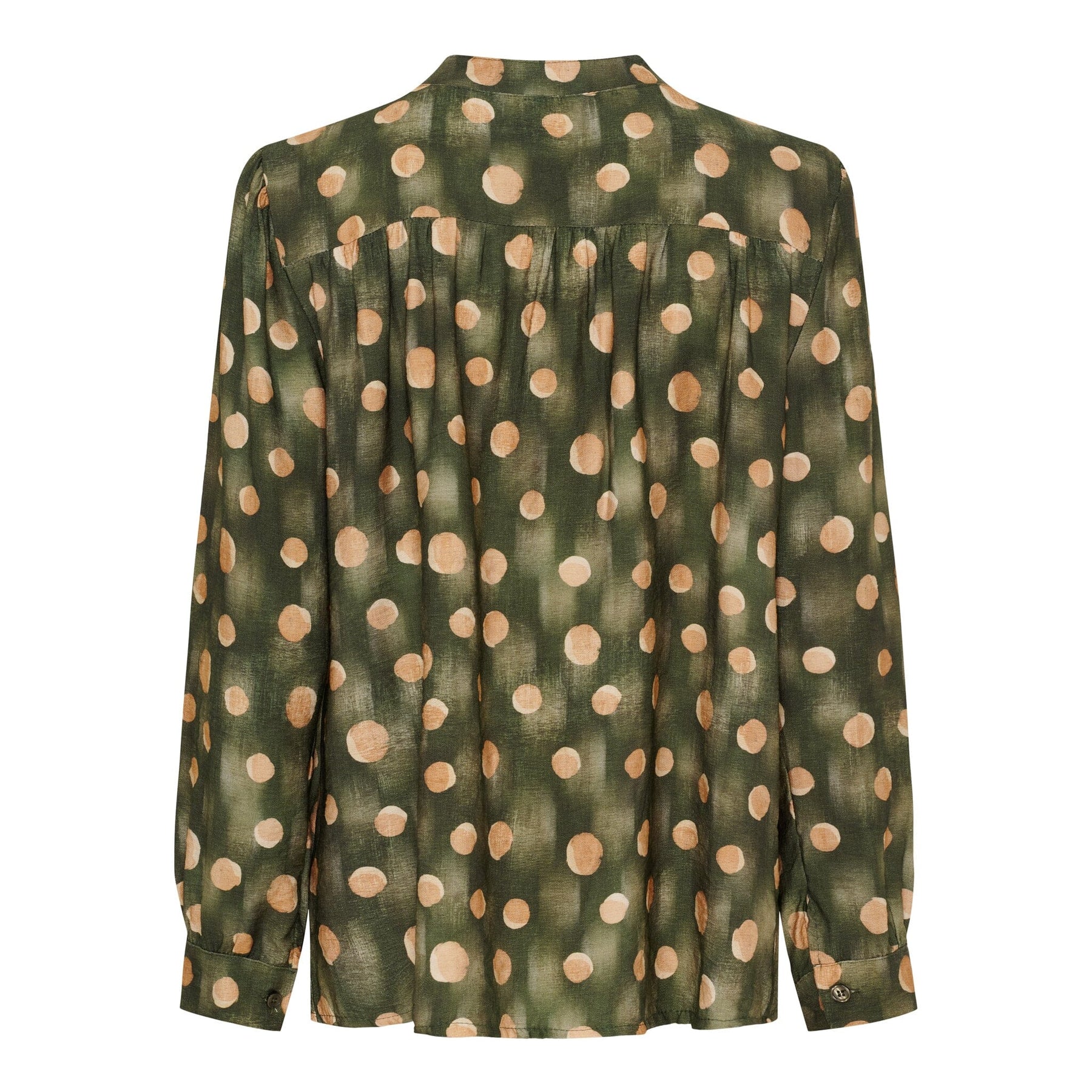 Blouse van Marta Du Chateau in legergroen met lichte stippen. Het losse model heeft een overhemdkraag, knopen over de hele lengte en lange mouwen.