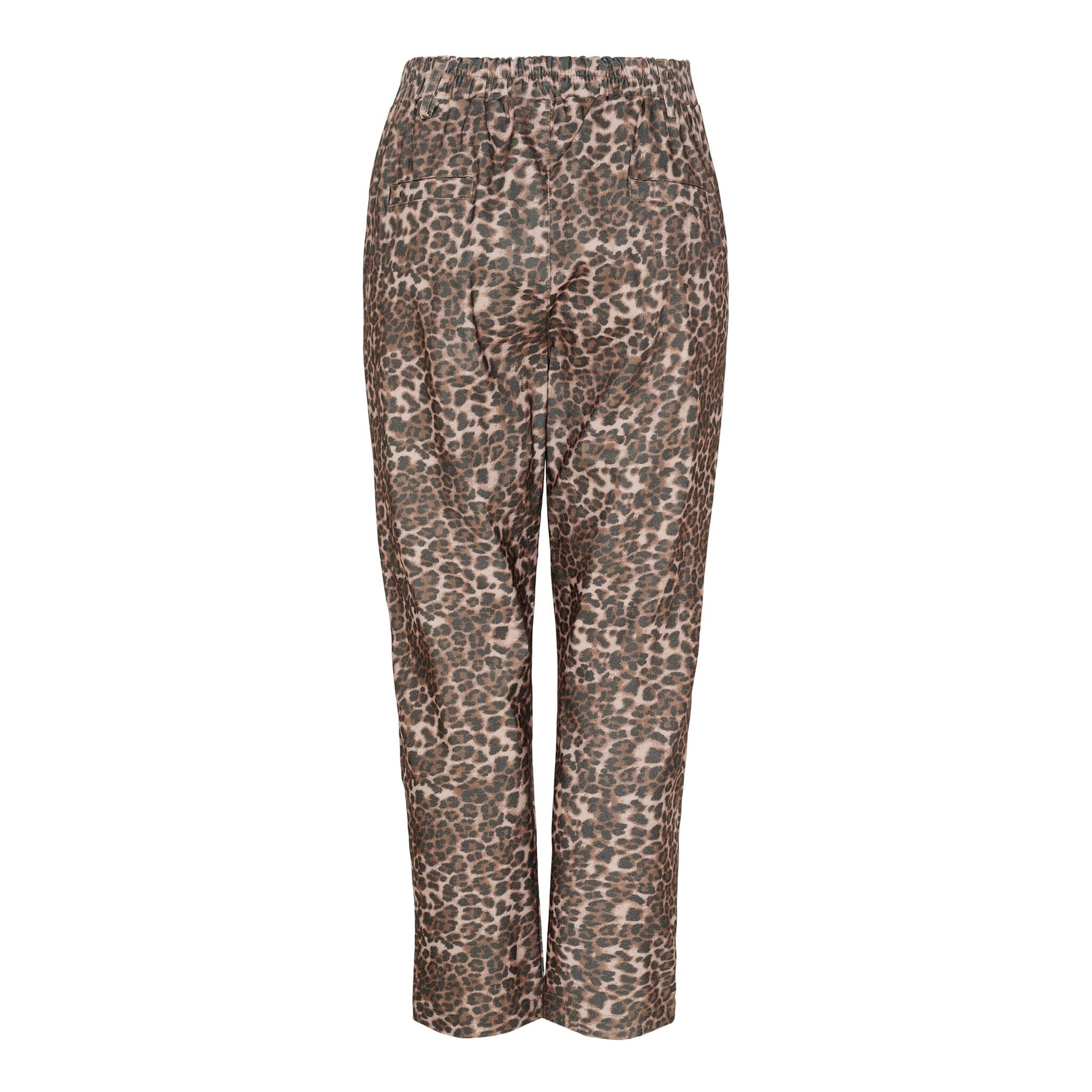 Broek van Marta Du Chateau met een bruin luipaardpatroon. De lange broek heeft zakken aan de voorkant en een combinatie van rits en elastiek in de taille.