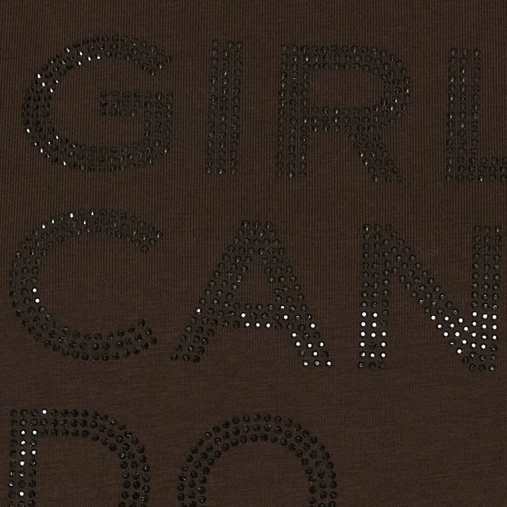 Een donkerbruine T-shirt van Marta Du Chateau met de tekst GIRLS CAN DO ANYTHING in glinsterende pailletten op de voorkant.