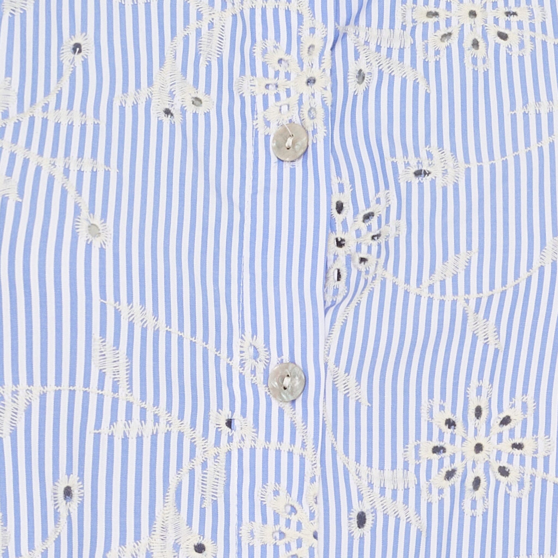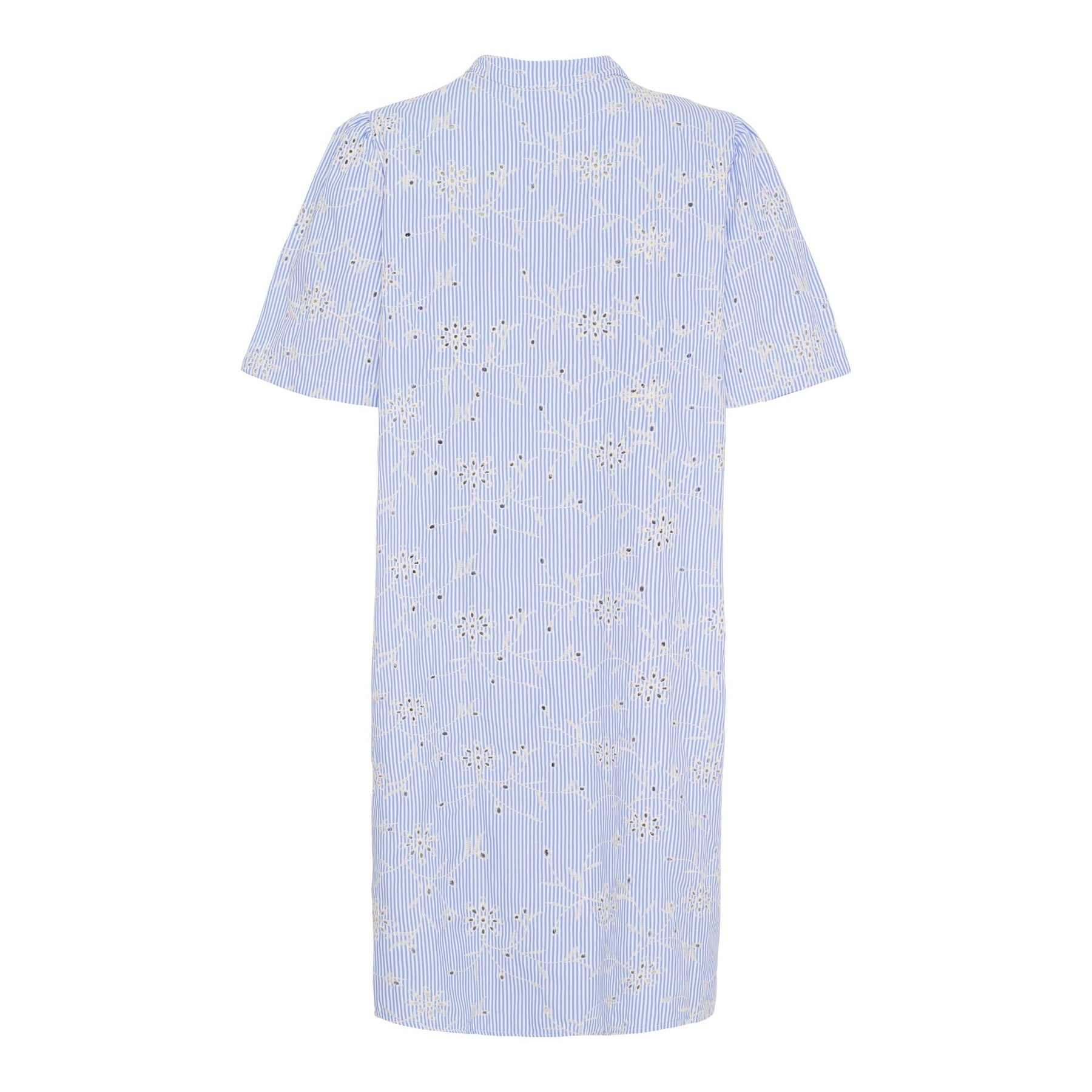 Knielange jurk van Marta Du Chateau in lichtblauw met witte strepen. De jurk heeft een overhemdkraag, knoopsluiting aan de voorkant en korte mouwen. De bloemenborduursel zorgt voor een mooie interactie met de strepen.