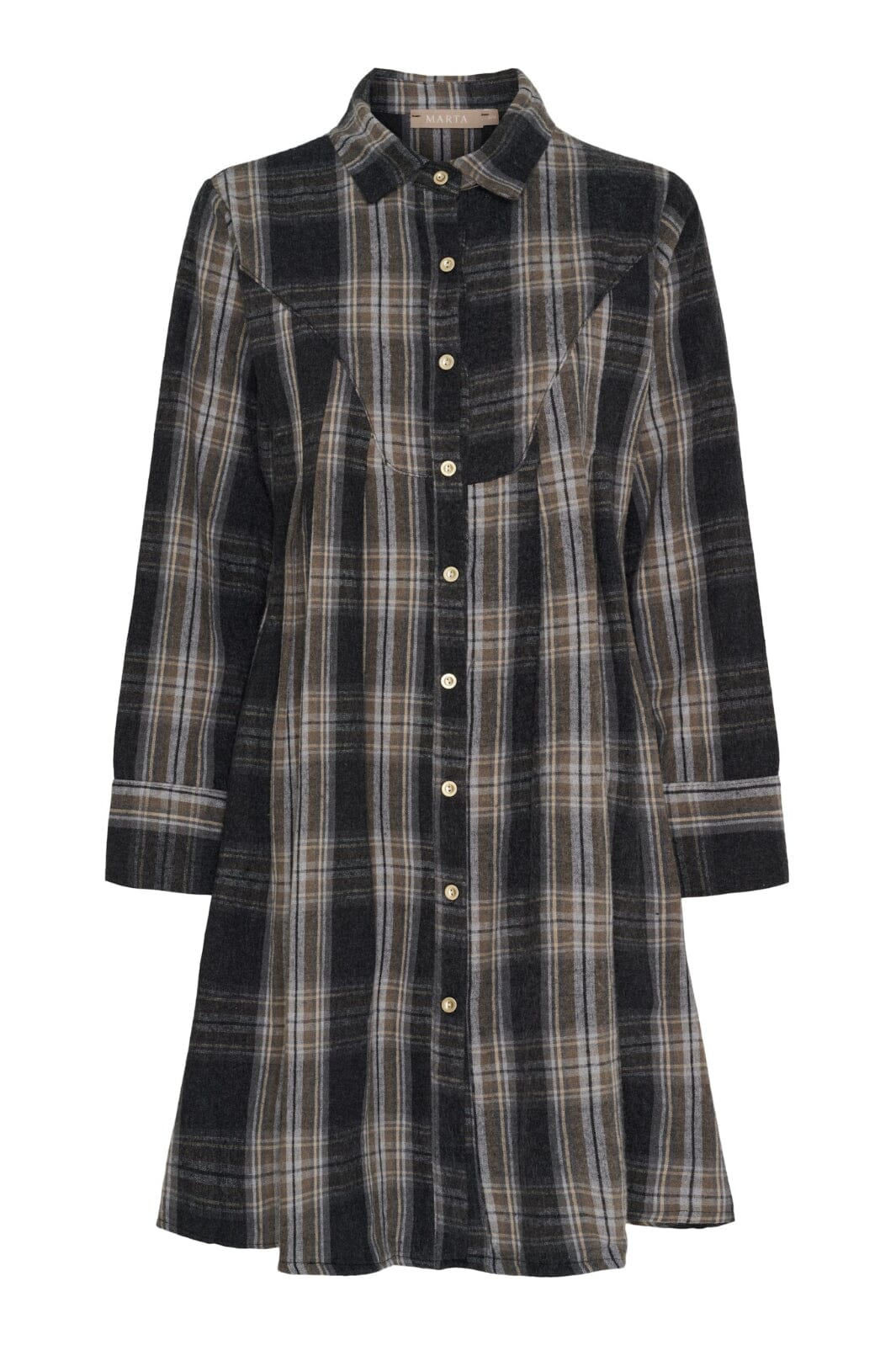 Grijs geruit jurk van Marta Du Chateau met overhemdkraag en knoopsluiting aan de voorkant. De jurk heeft 3/4 mouwen en plooien die het een vrouwelijke uitstraling geven.