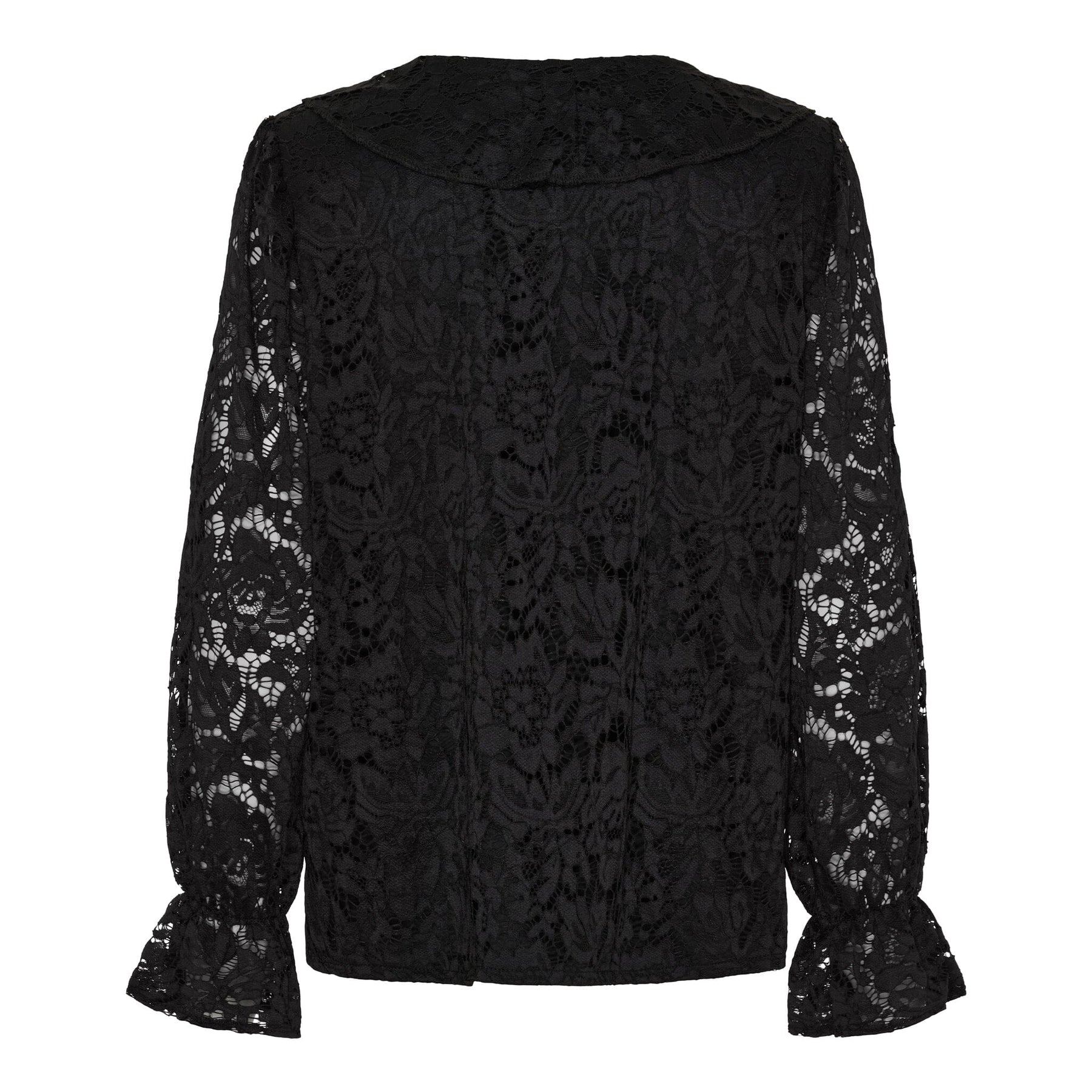 Zwarte kanten blouse van Marta Du Chateau met een V-hals en ruches. De blouse heeft lange mouwen met kanten details en is geschikt voor zowel formele als casual gelegenheden.