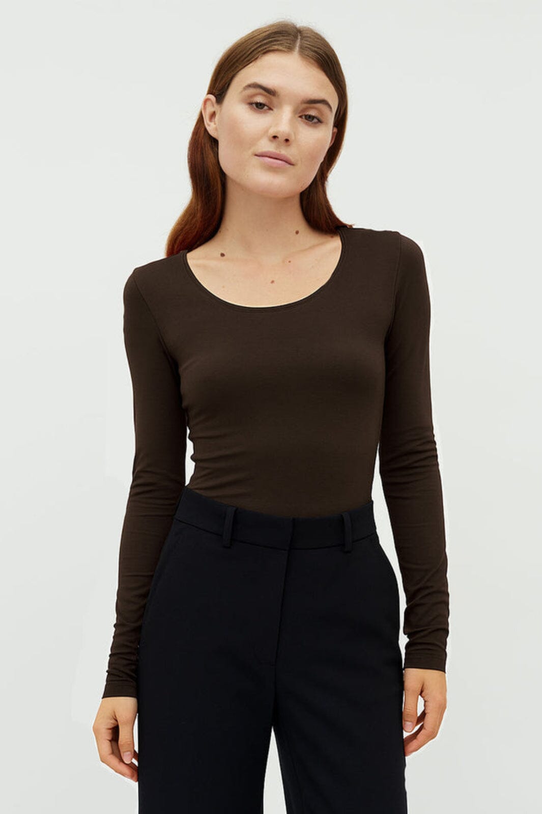 Een longsleeve top van MbyM in een donkerbruine kleur. De top heeft een aangesloten pasvorm en is gemaakt van modal met elastaan.