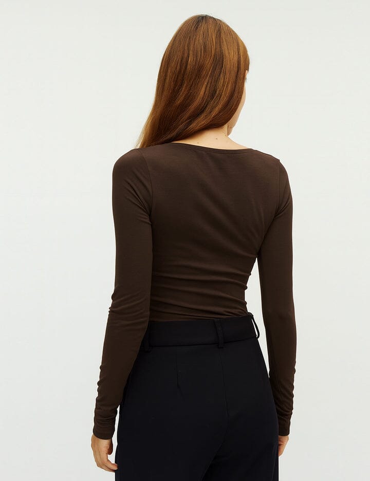 Een longsleeve top van MbyM in een donkerbruine kleur. De top heeft een aangesloten pasvorm en is gemaakt van modal met elastaan.