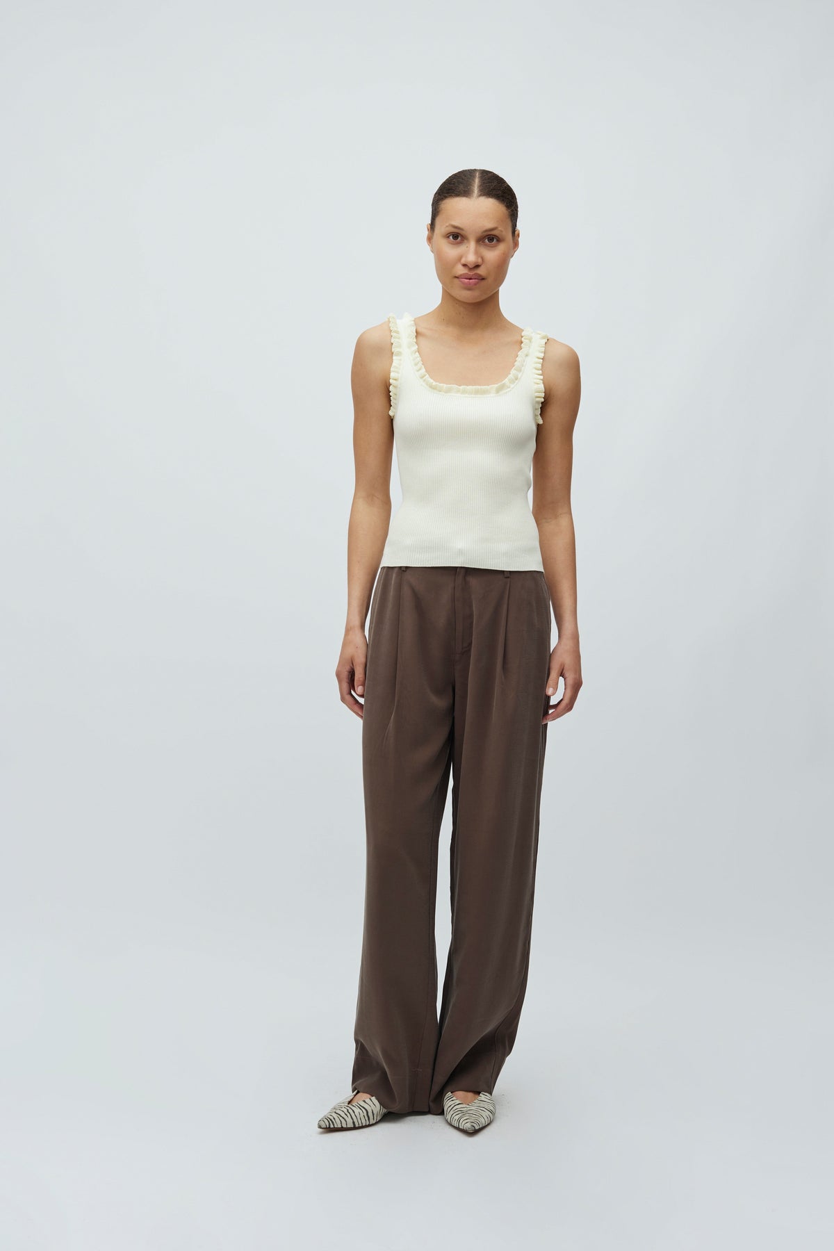 Mouwloze top van MbyM in een lichte, romig gele kleur. De top heeft een aangesloten pasvorm met ruches langs de vierkante halslijn en de bandjes.