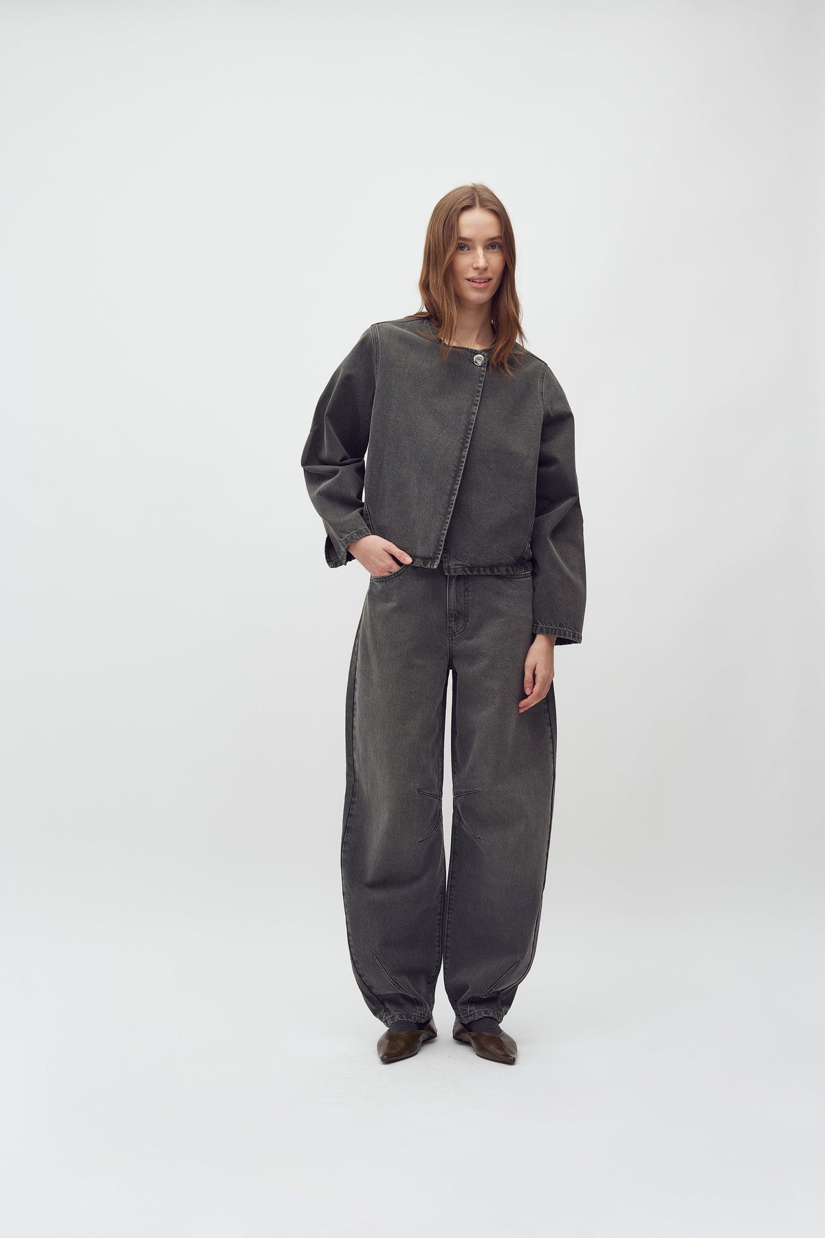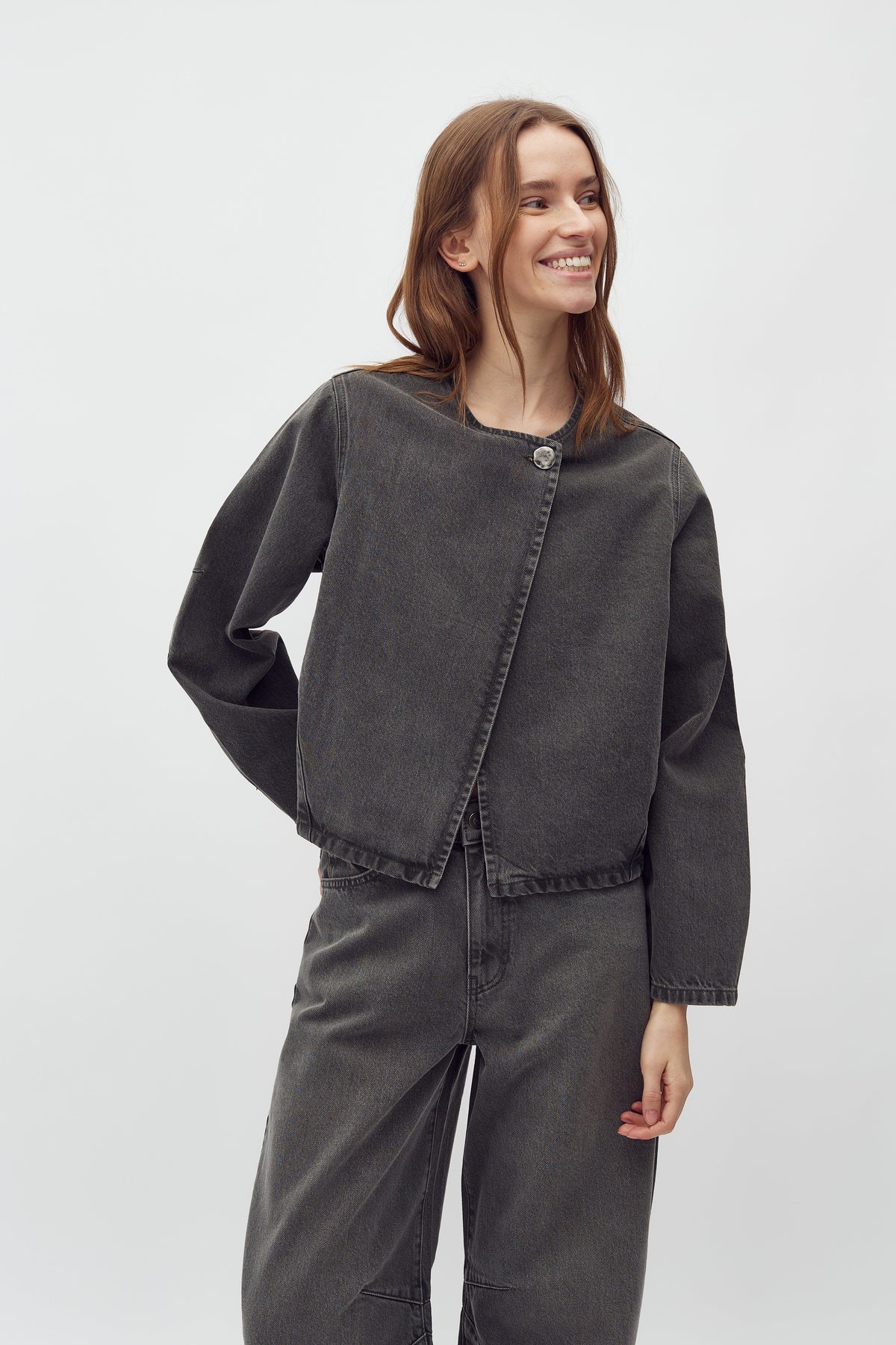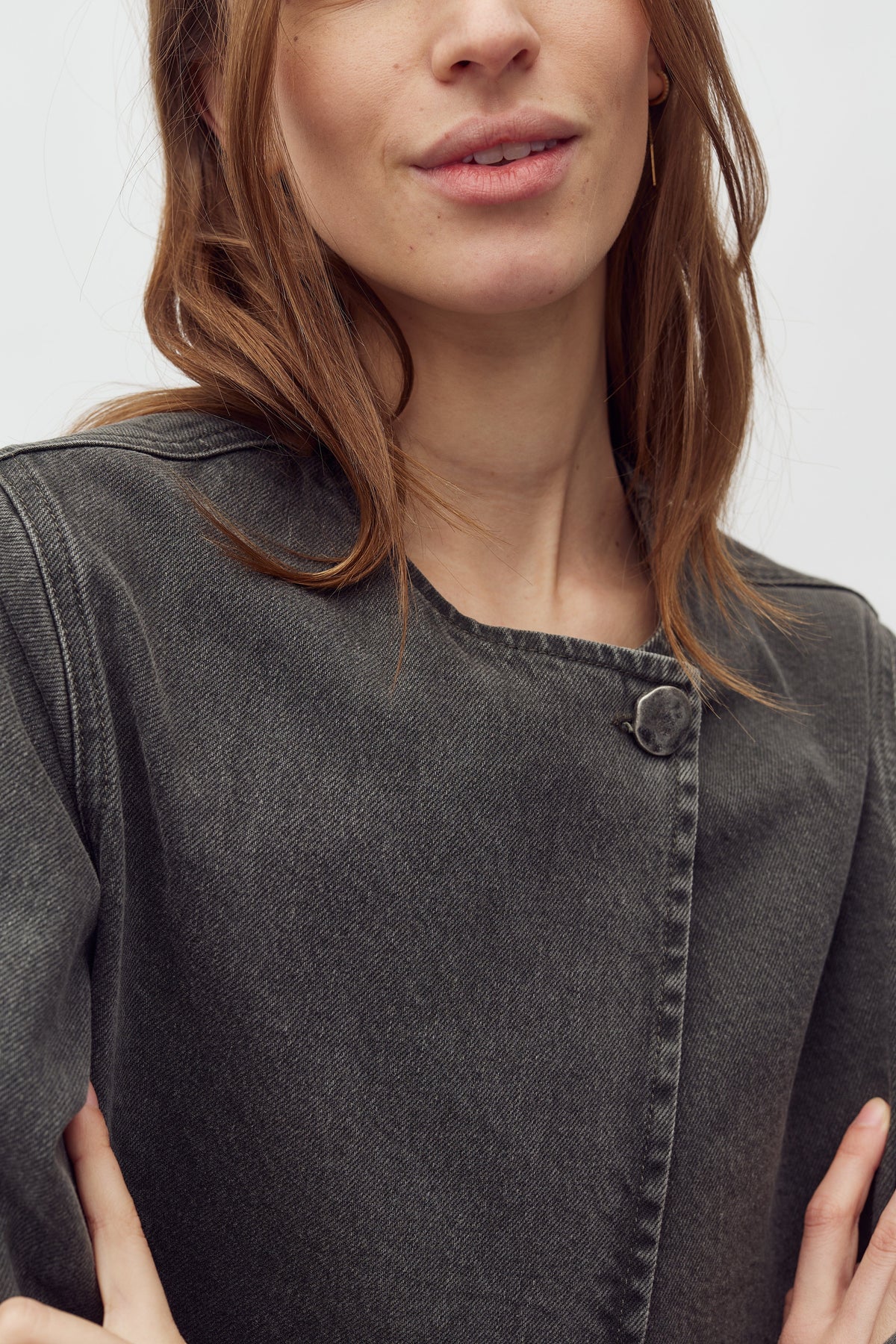 Khaki groene jas van MbyM met een oversized pasvorm. Hij heeft een acid wash-effect en decoratieve stiksels, die de jas een rustieke uitstraling geven.