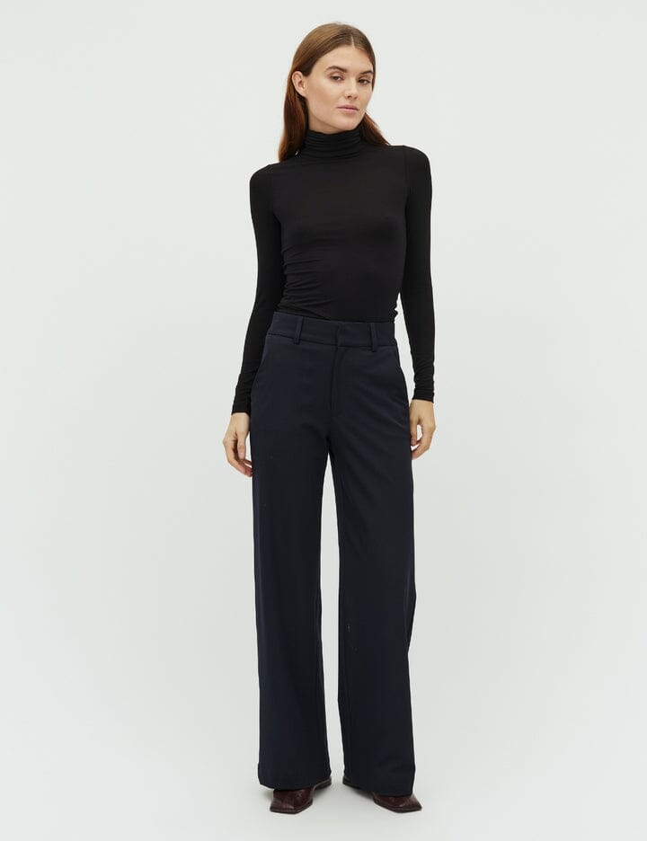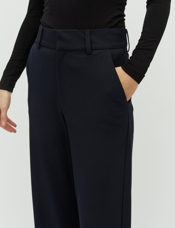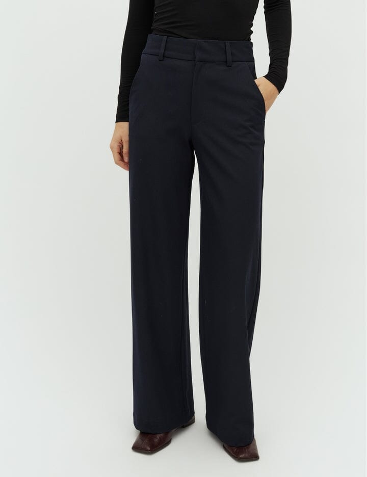 Donkerblauwe broek van MbyM met een losse pasvorm en wijde pijpen. De broek is vloerlang en heeft een normale taillehoogte met riemlussen.
