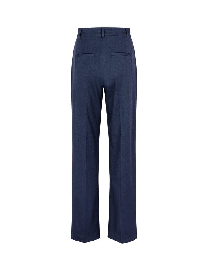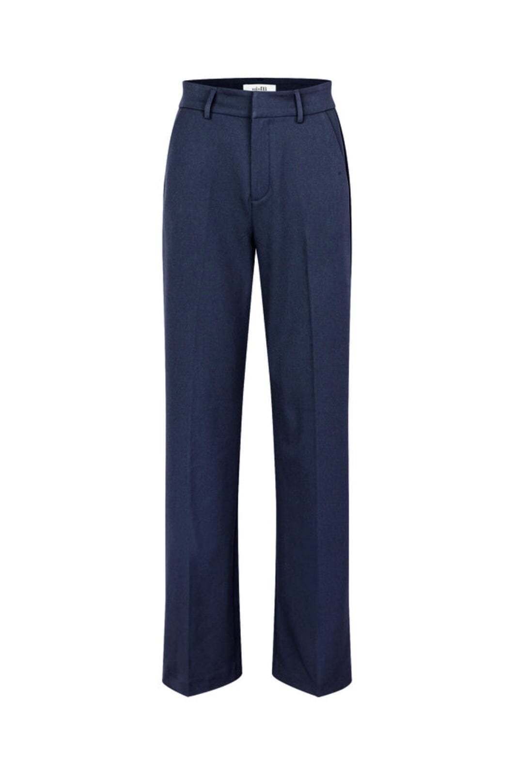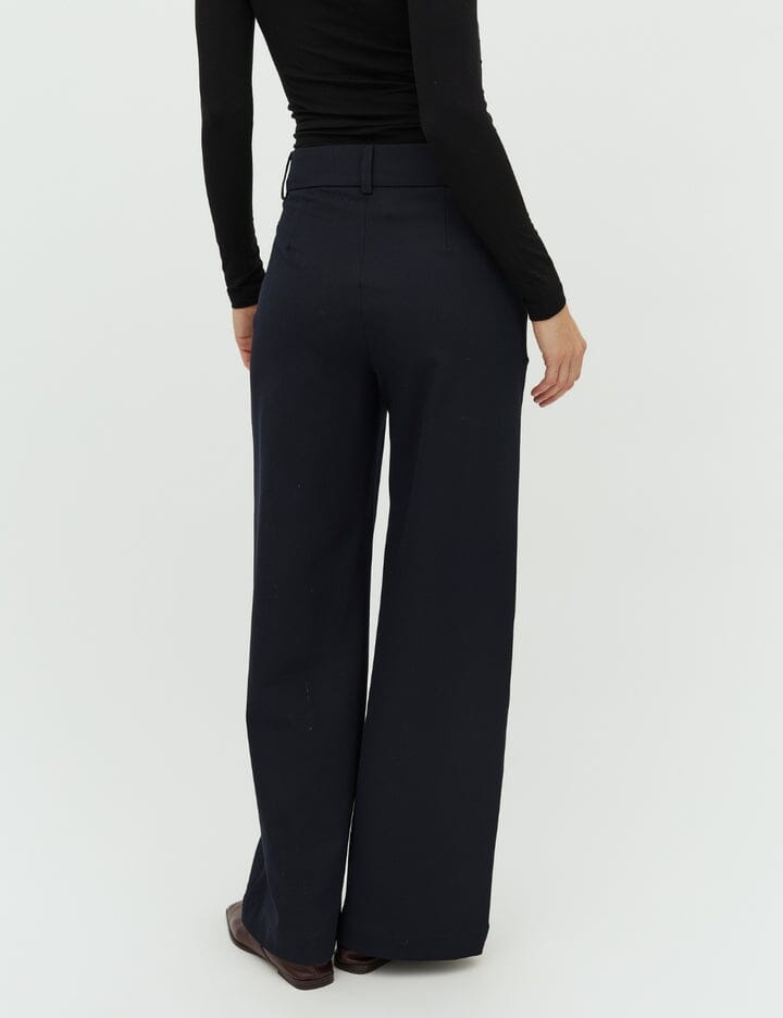 Donkerblauwe broek van MbyM met een losse pasvorm en wijde pijpen. De broek is vloerlang en heeft een normale taillehoogte met riemlussen.