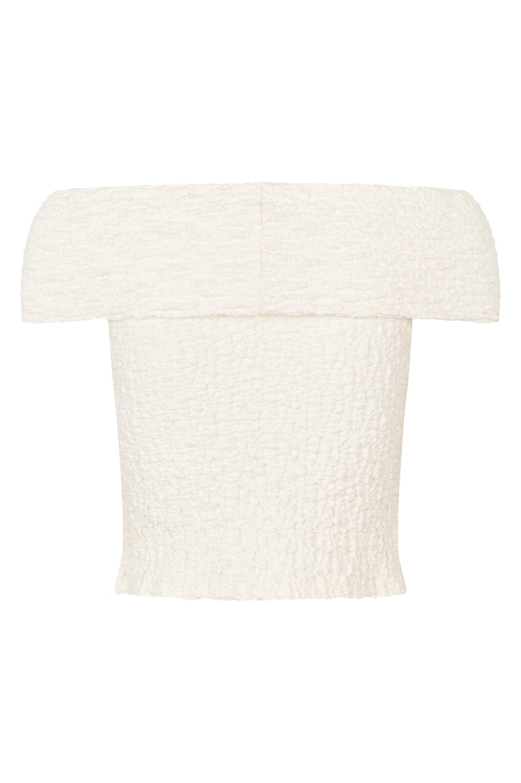 Off-shoulder top van MbyM in een lichte suiker kleur. De top heeft een gestructureerd oppervlak en ruchesdetails die het een uniek karakter geven. Gemaakt van een mix van katoen, nylon en elastaan.