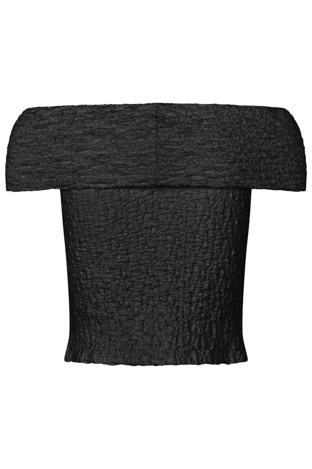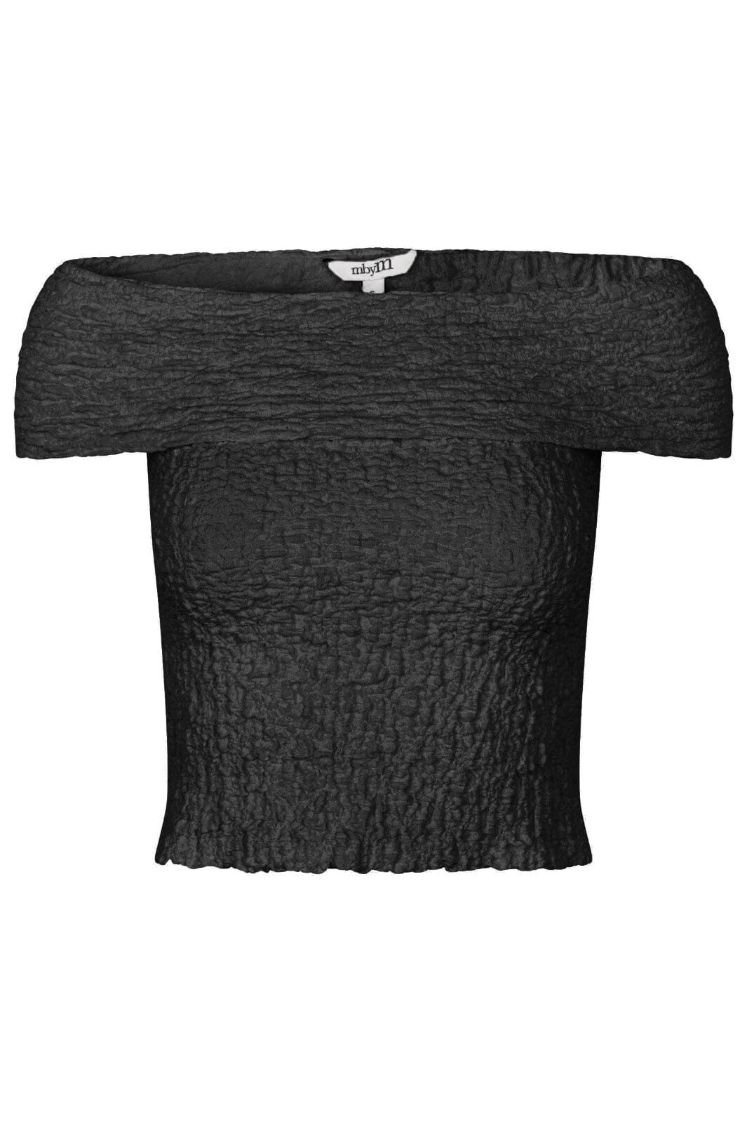 Zwarte off-shoulder top van MbyM met gerimpelde textuur en ruches. De top heeft een gestructureerd oppervlak met golvende details die het een uniek uiterlijk geven.