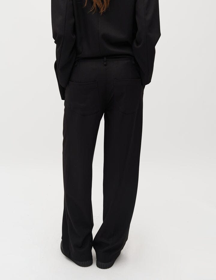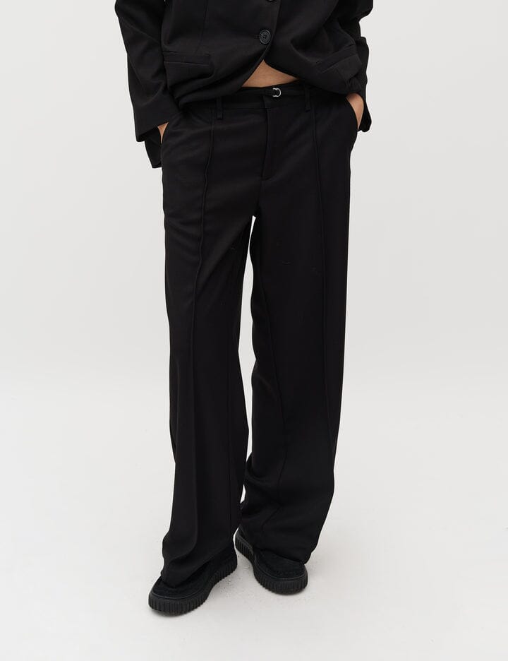 Zwarte broeken van MbyM met decoratieve stiksels en riemdetails. De broeken hebben een brede broekopening en zijn vloerlengte, en ze passen zowel bij casual als formele gelegenheden.