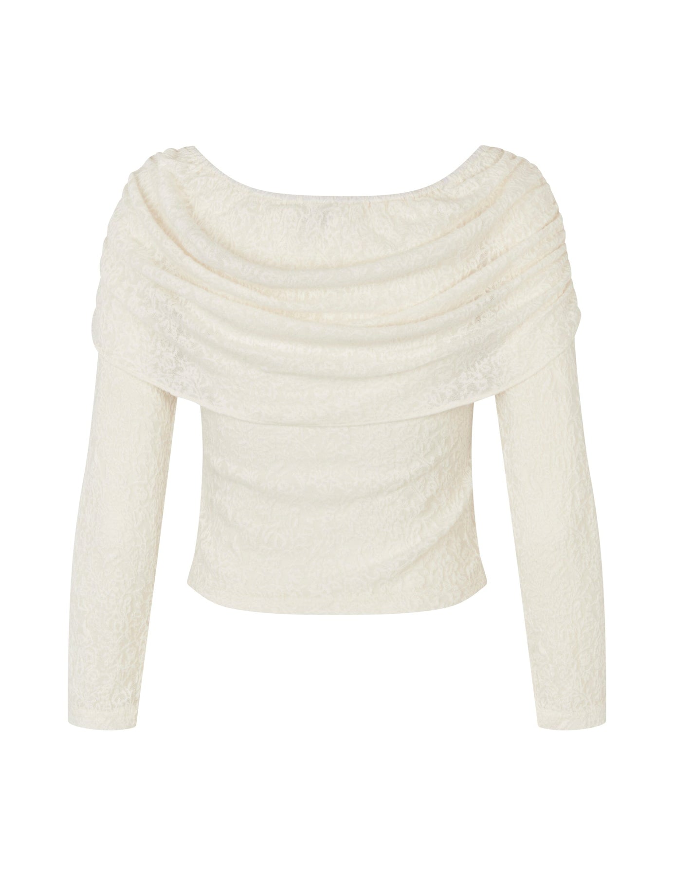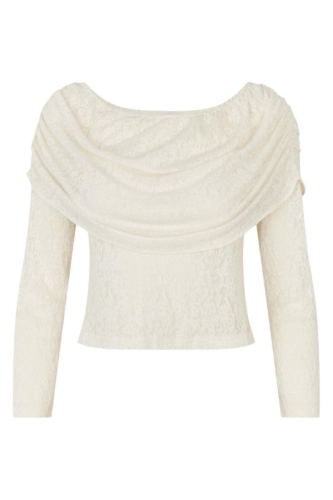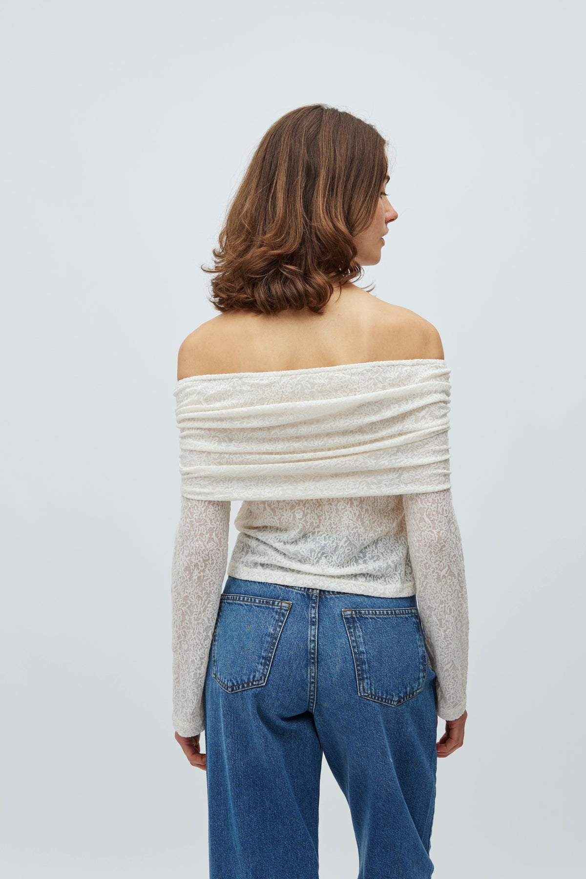Blouse van MbyM in crème met off-shoulder halslijn en bloemenpatroon. De blouse heeft kant en ruches, wat zorgt voor een vrouwelijke uitstraling.