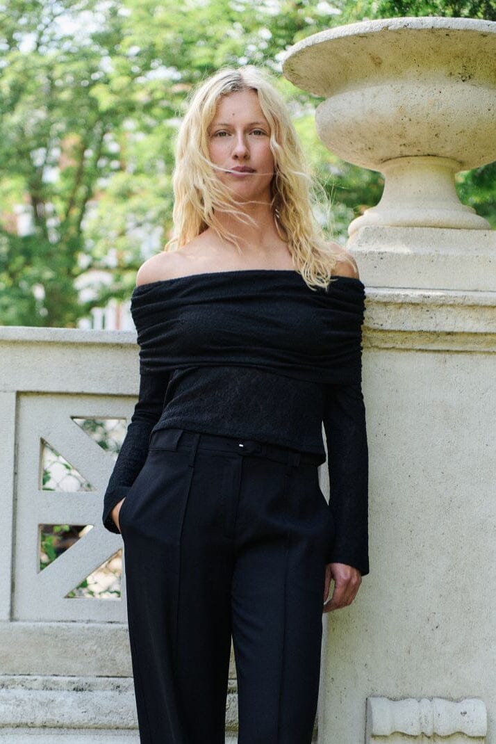 Zwarte off-shoulder blouse van MbyM met bloemenkant en ruches. De blouse heeft een slim fit en lange mouwen.