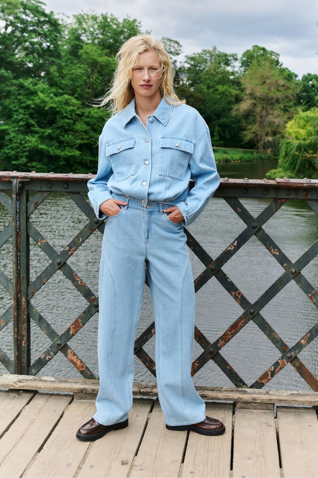 Jeans van MbyM in lichtblauw met een losse pasvorm. De jeans hebben een hoge taille en een lengte tot op de grond.