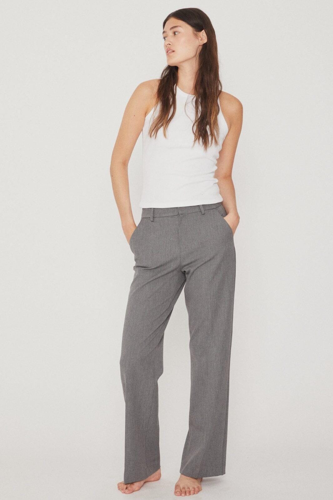 Grijze broeken van MbyM in gemêleerd stof. De broeken hebben een rechte pasvorm en enkel lengte met voorzakken. De stof heeft een neutrale melange-structuur.
