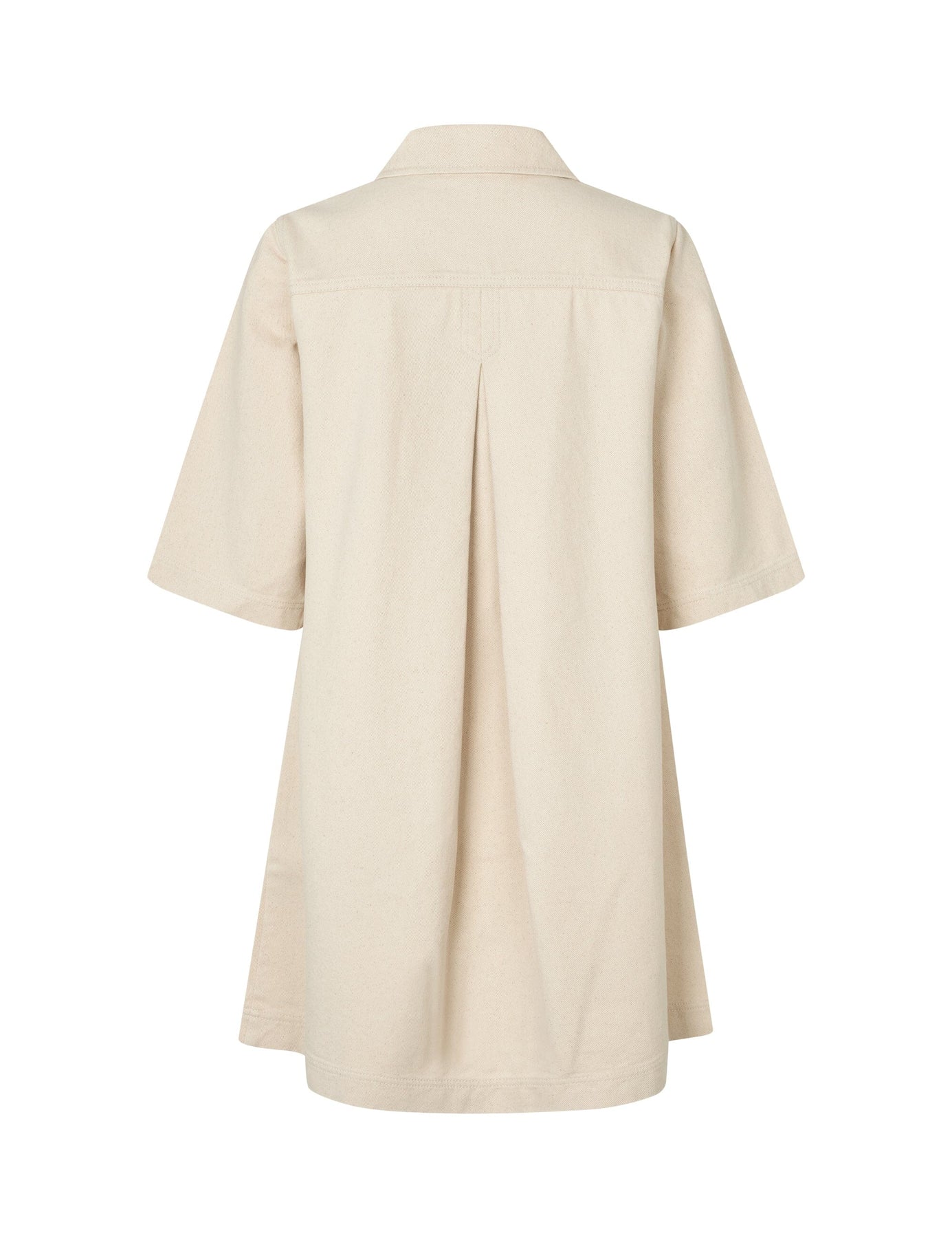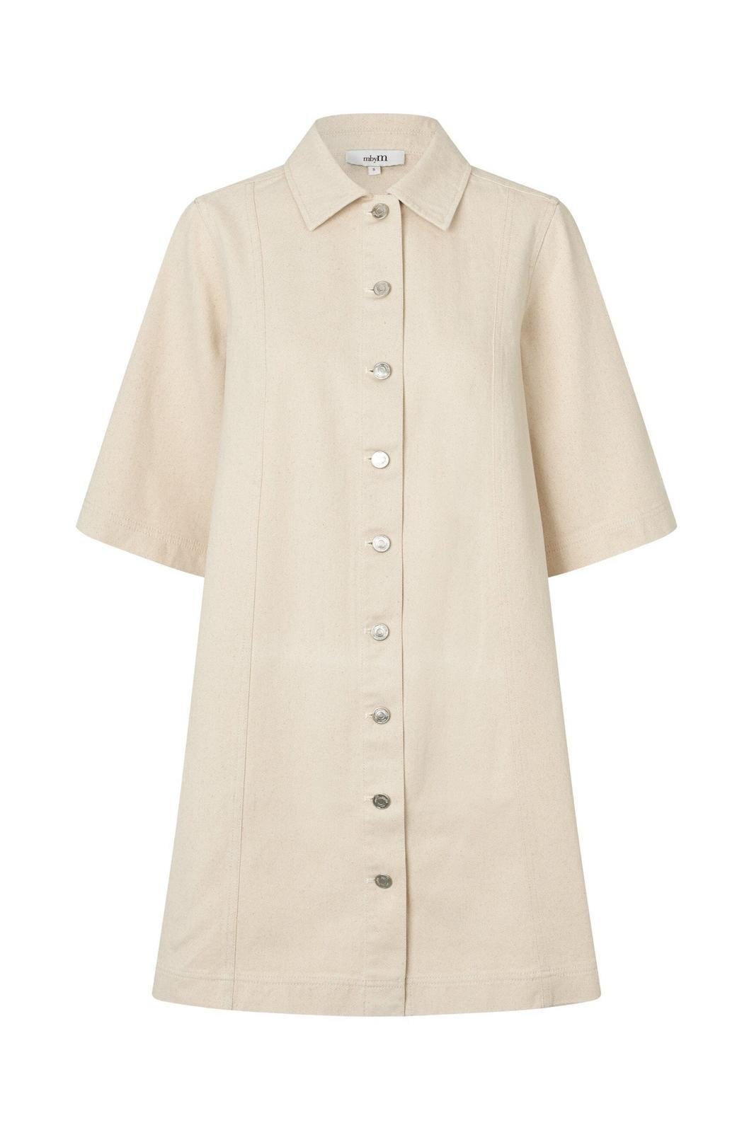 Een beige overhemdjurk van MbyM, gemaakt van 100% katoen. De jurk heeft een overhemdkraag, korte mouwen en een knoopsluiting over de hele voorkant.
