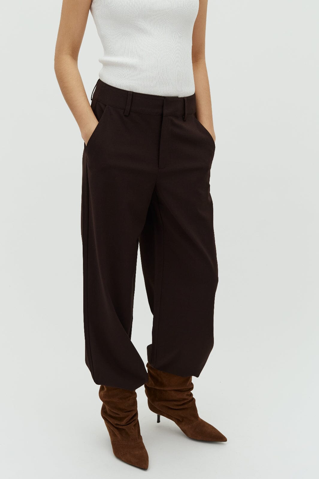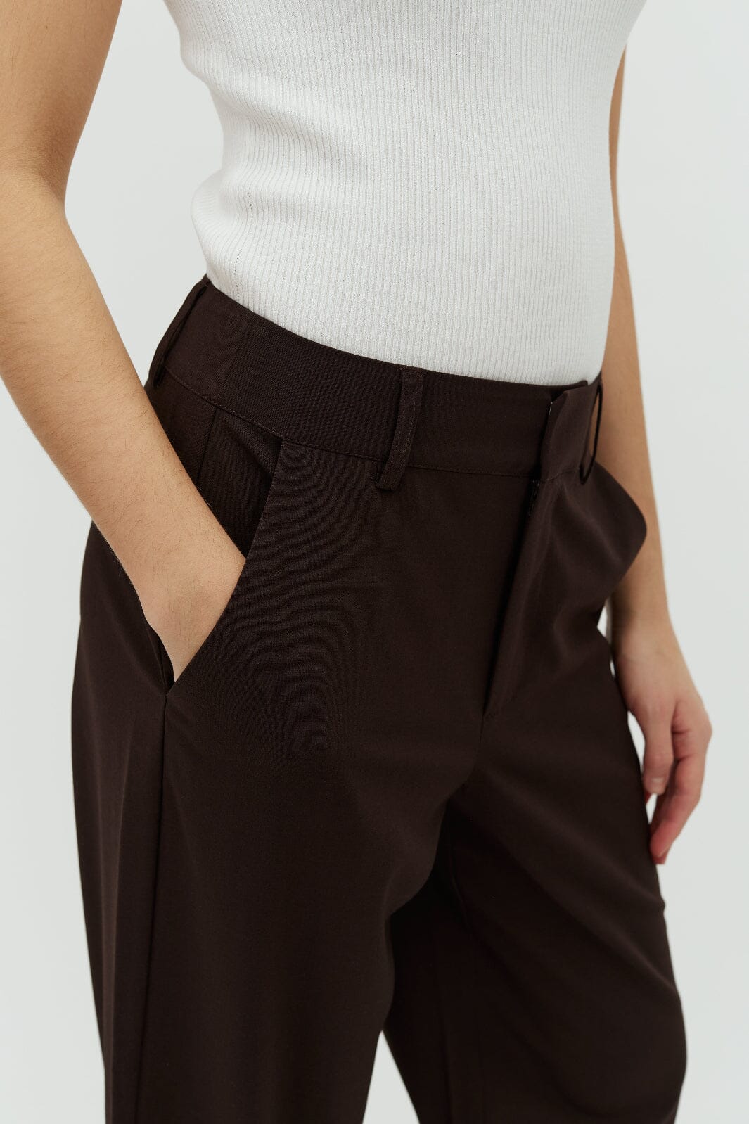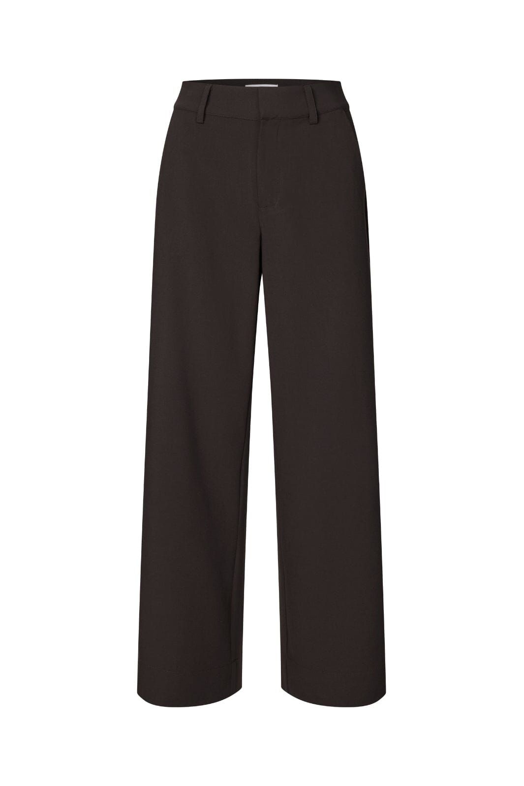 Donkerbruine broek van MbyM met rechte pijpen, riemlussen en steekzakken. De broek heeft een losse pasvorm en een lengte tot aan de vloer.