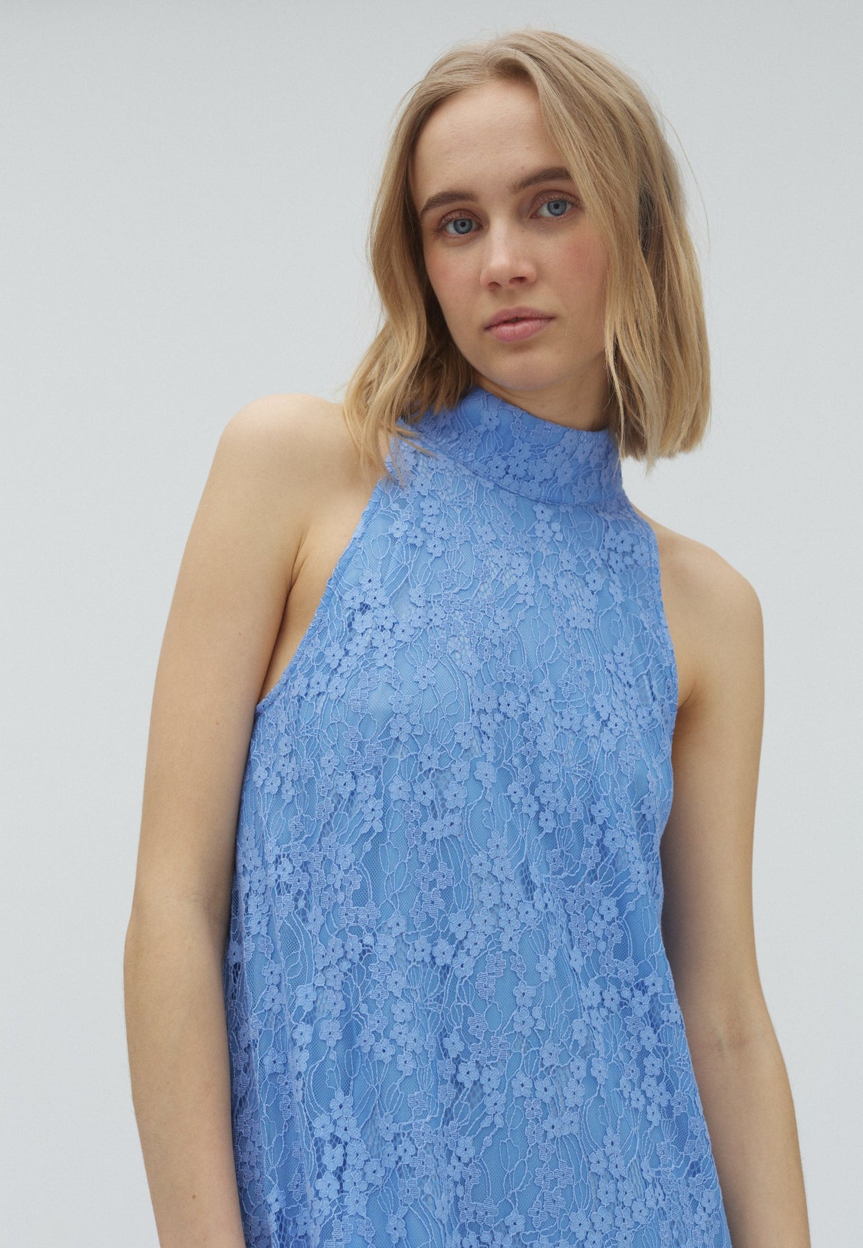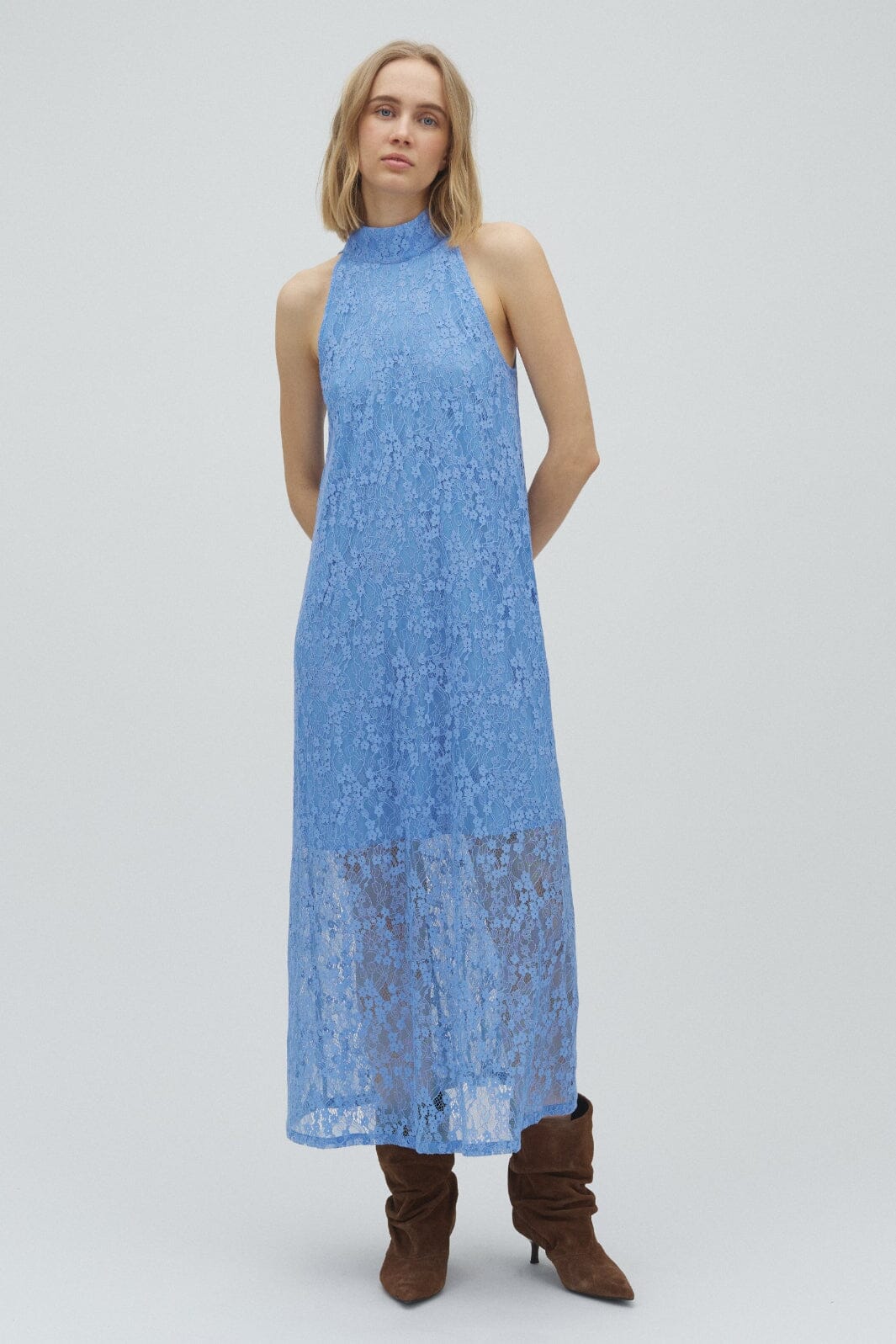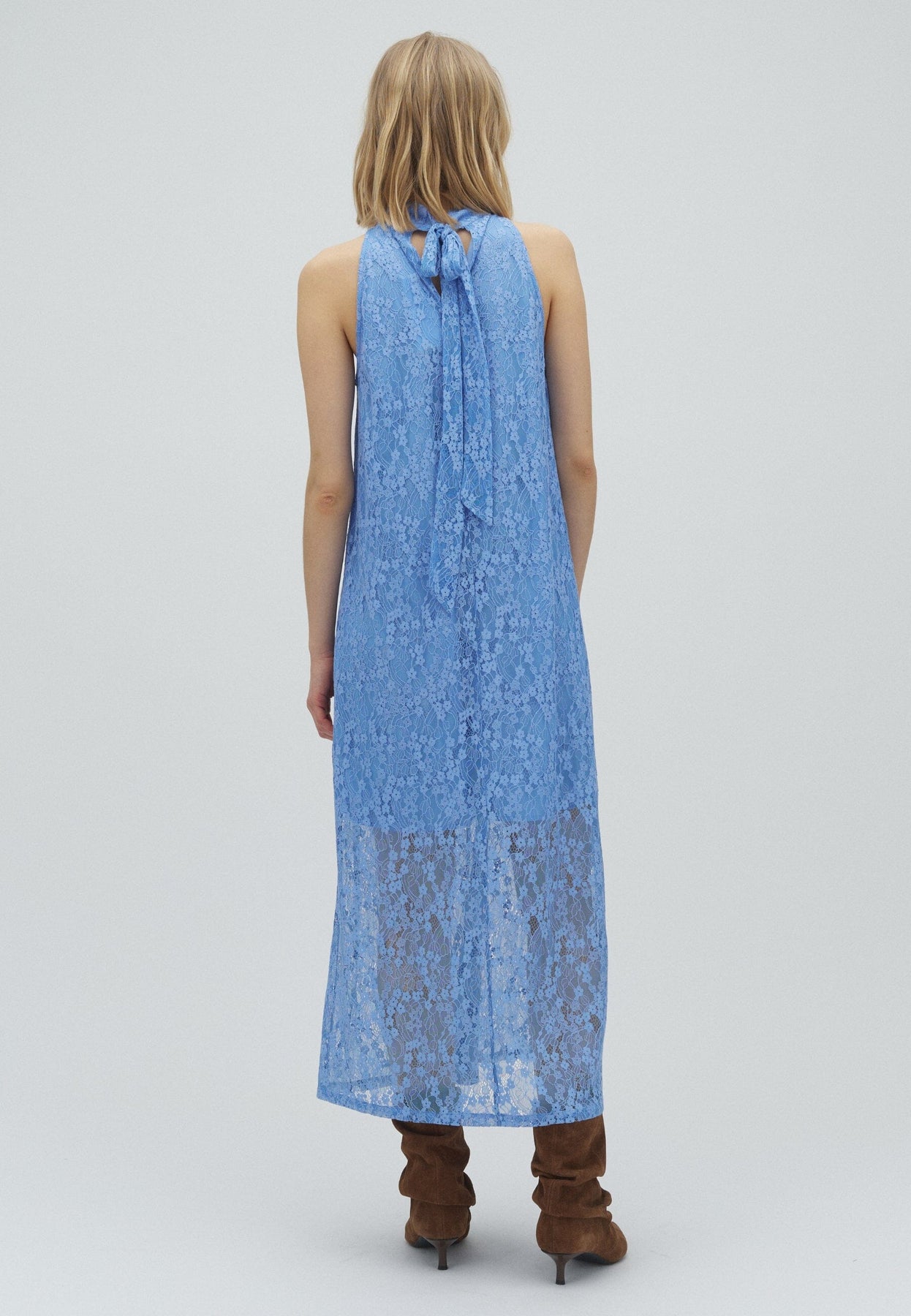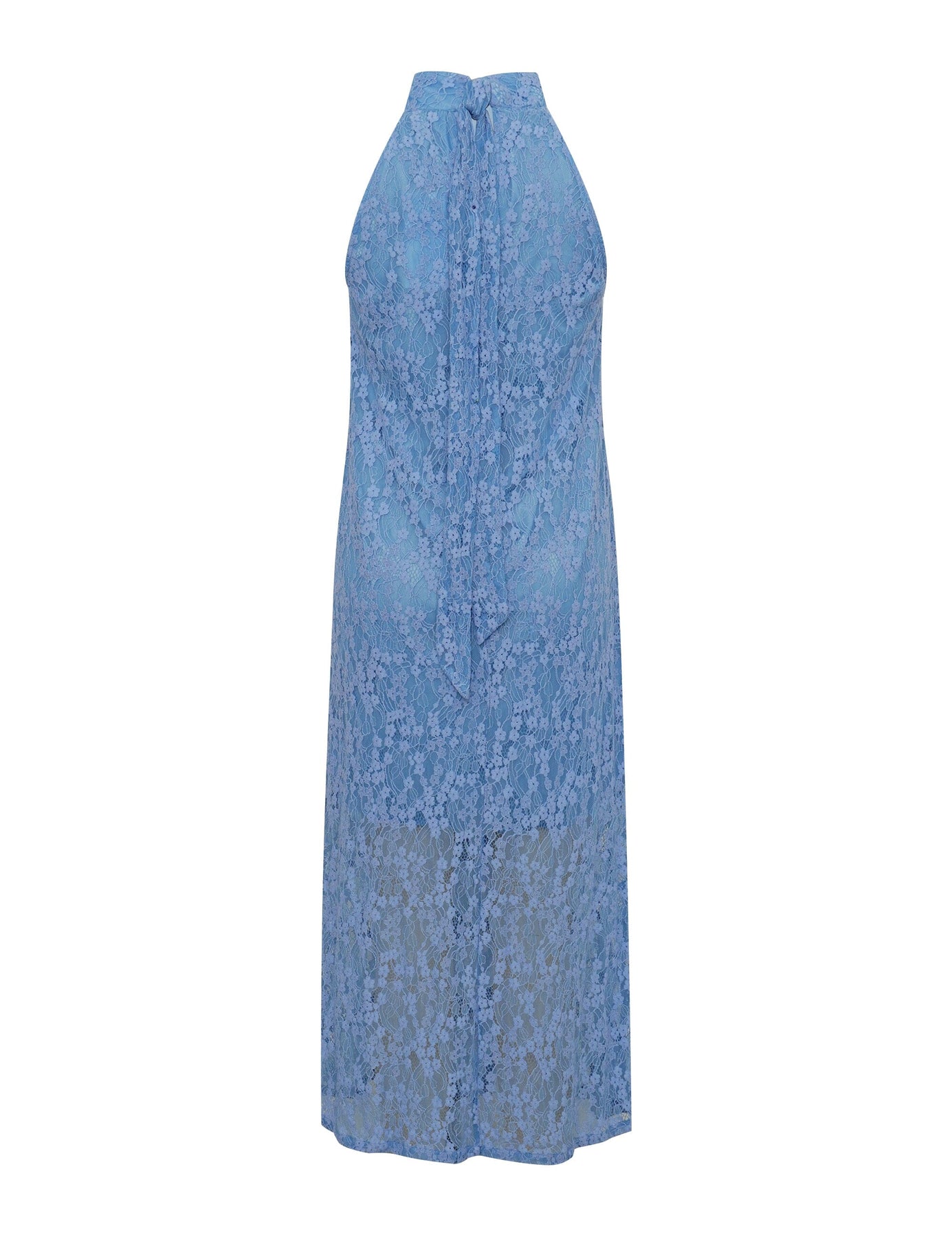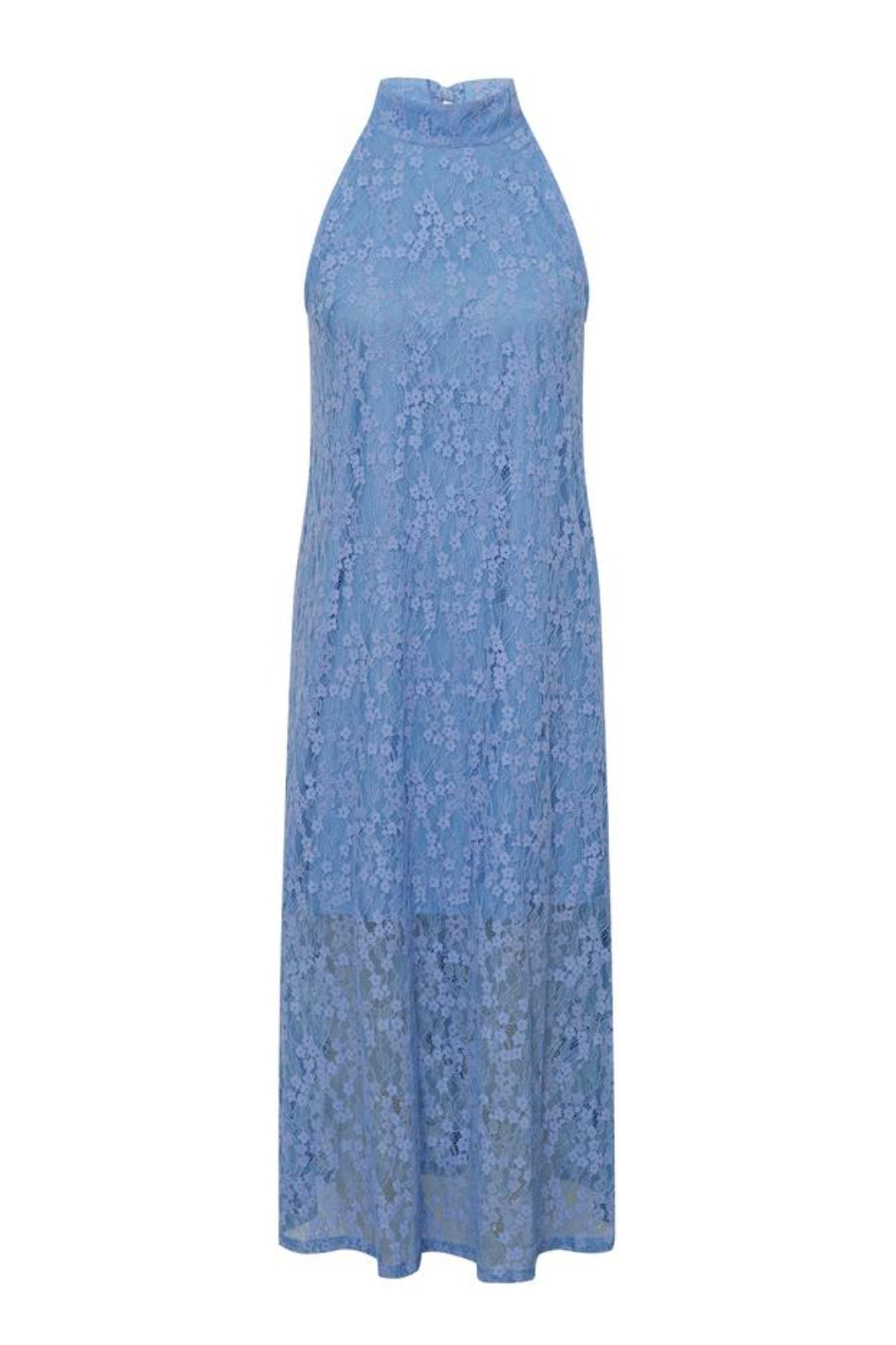 Jurk van MbyM in lichtblauw met een bloemenpatroon van kant. De jurk is mouwloos met een hoge halslijn en valt tot op de kuit.