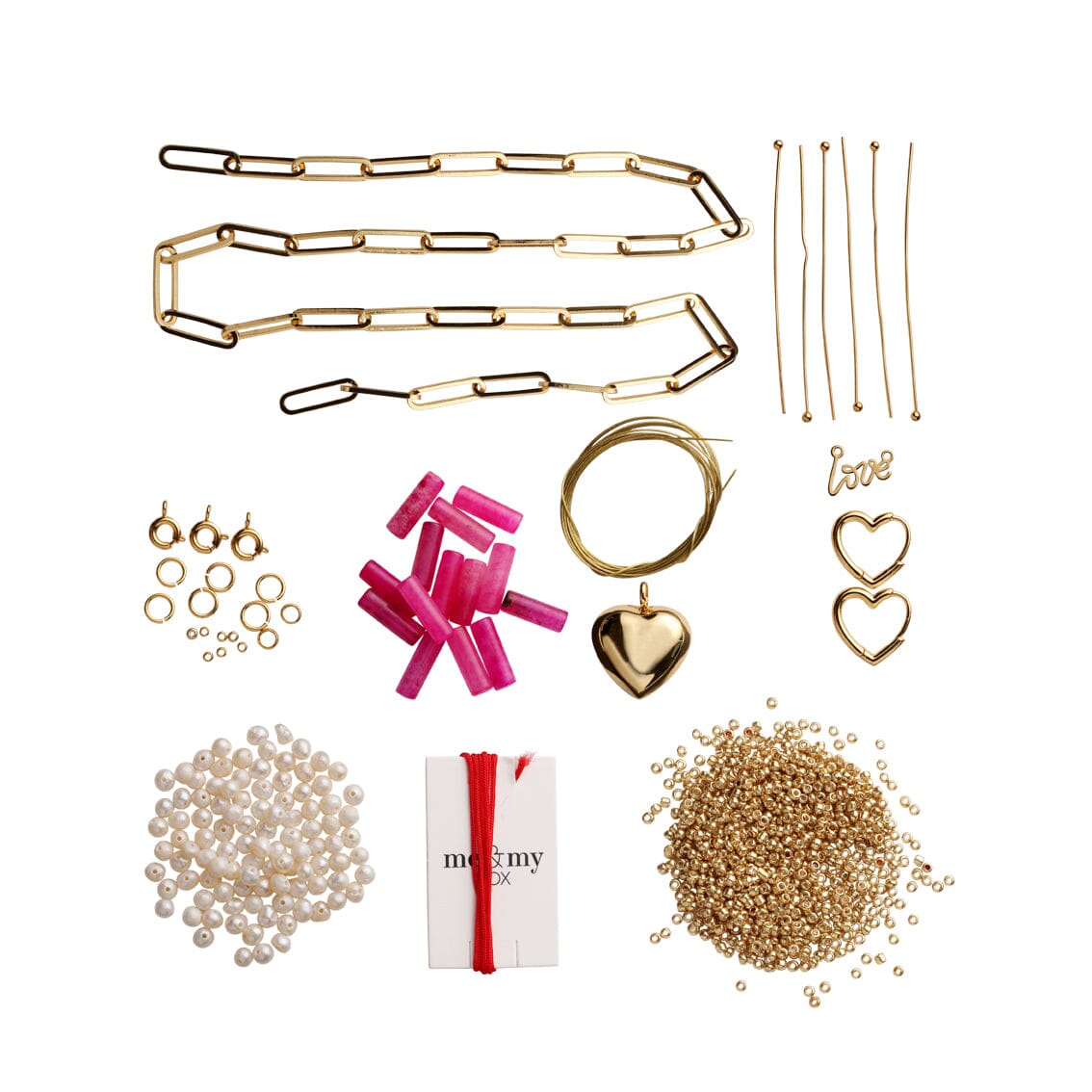 DIY sieradenbox van Me & My Box met roze buisparels en hartbedel. De box bevat onderdelen van 18K verguld messing en 925 zilvergeplateerde materialen om persoonlijke sieraden te maken.