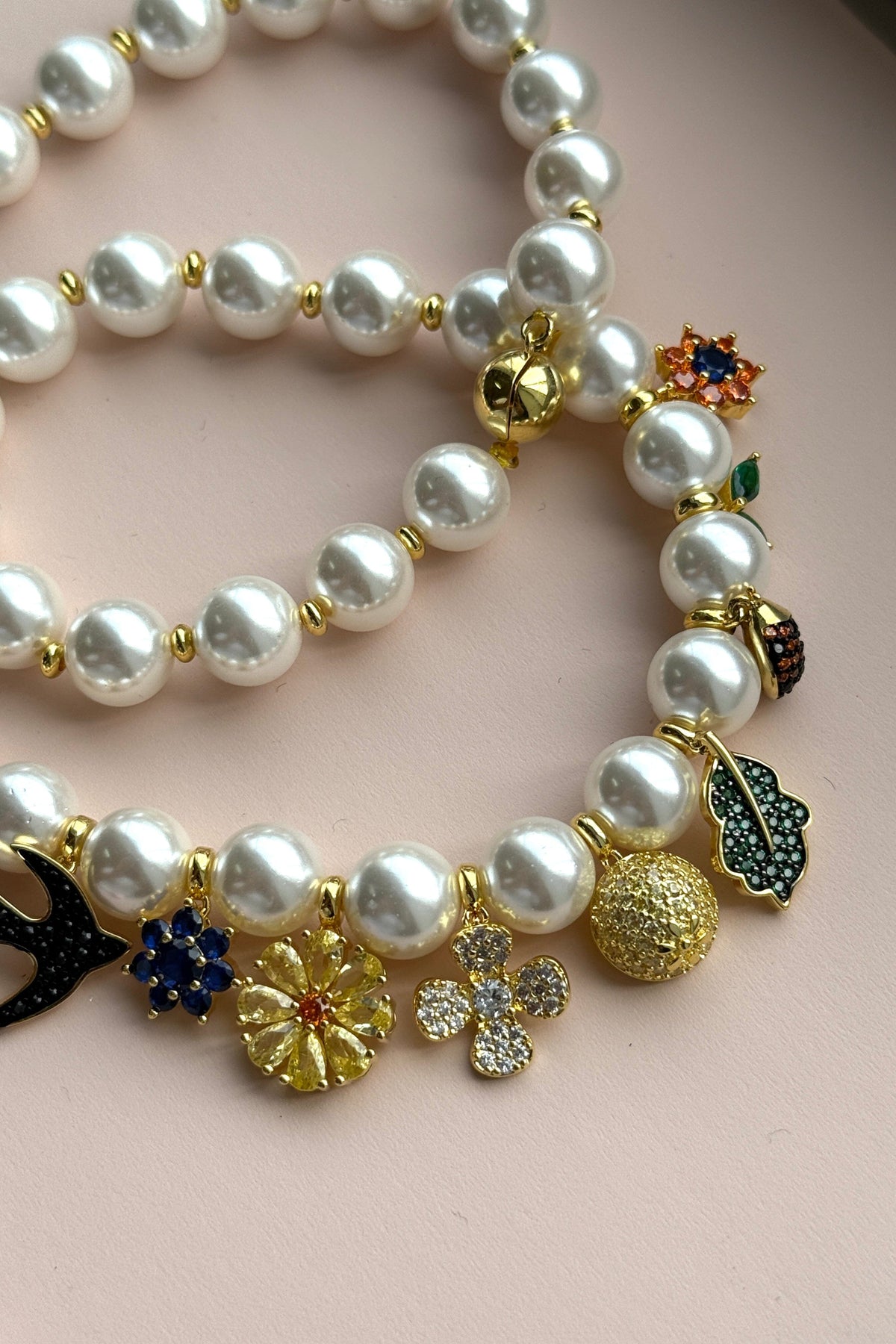 Verguldede ketting van Mellow Moon met witte parels en kleurrijke charms. De ketting heeft decoratieve elementen zoals bloemen en vogels in verschillende kleuren.