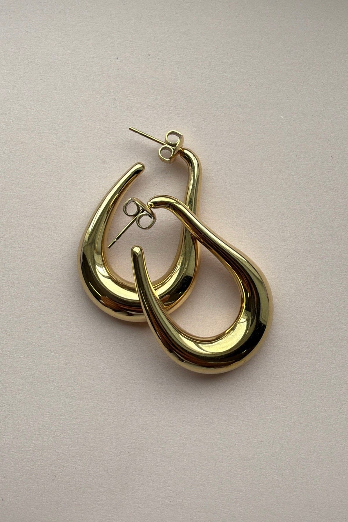 Gouden oorbellen van Mellow Moon met een gebogen vorm en een glad oppervlak. De oorbellen hebben een gepolijste afwerking die een glanzende uitstraling geeft.