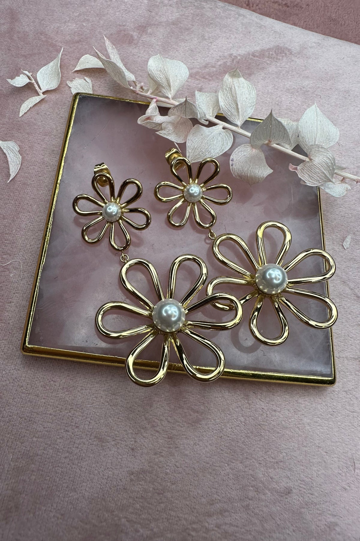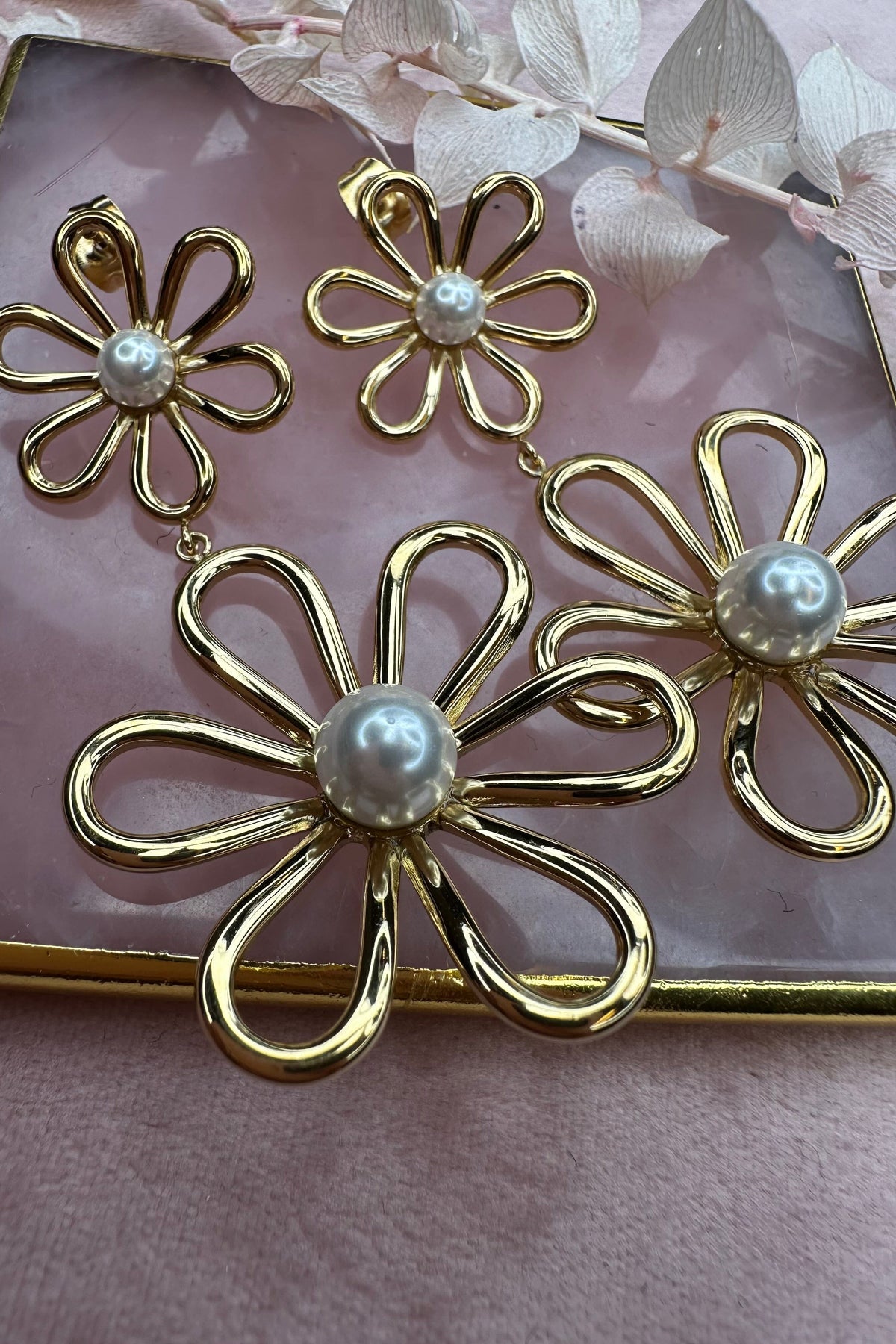 Hangende oorbellen van Mellow Moon met bloemenontwerp in goudkleurige afwerking. Twee bloemen in verschillende maten zijn verbonden met kettingen en hebben pareldetails in het midden.