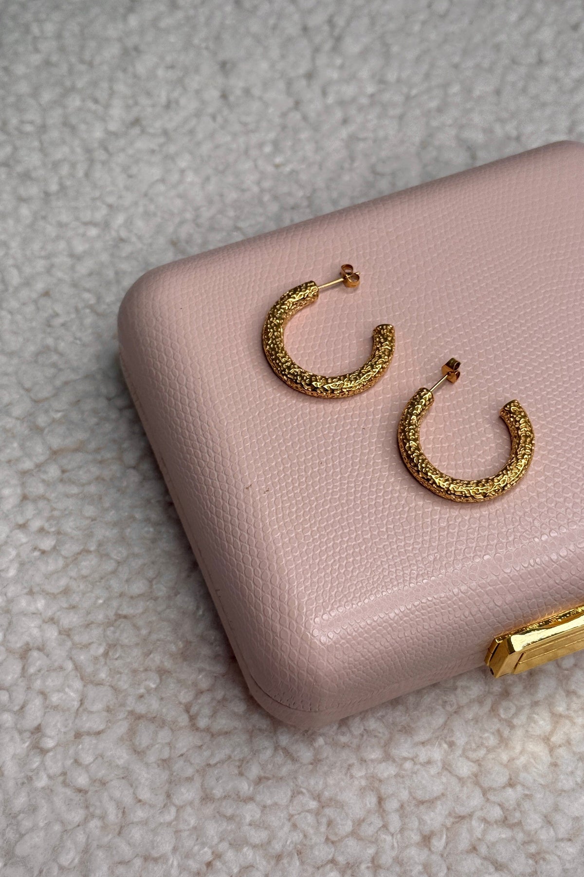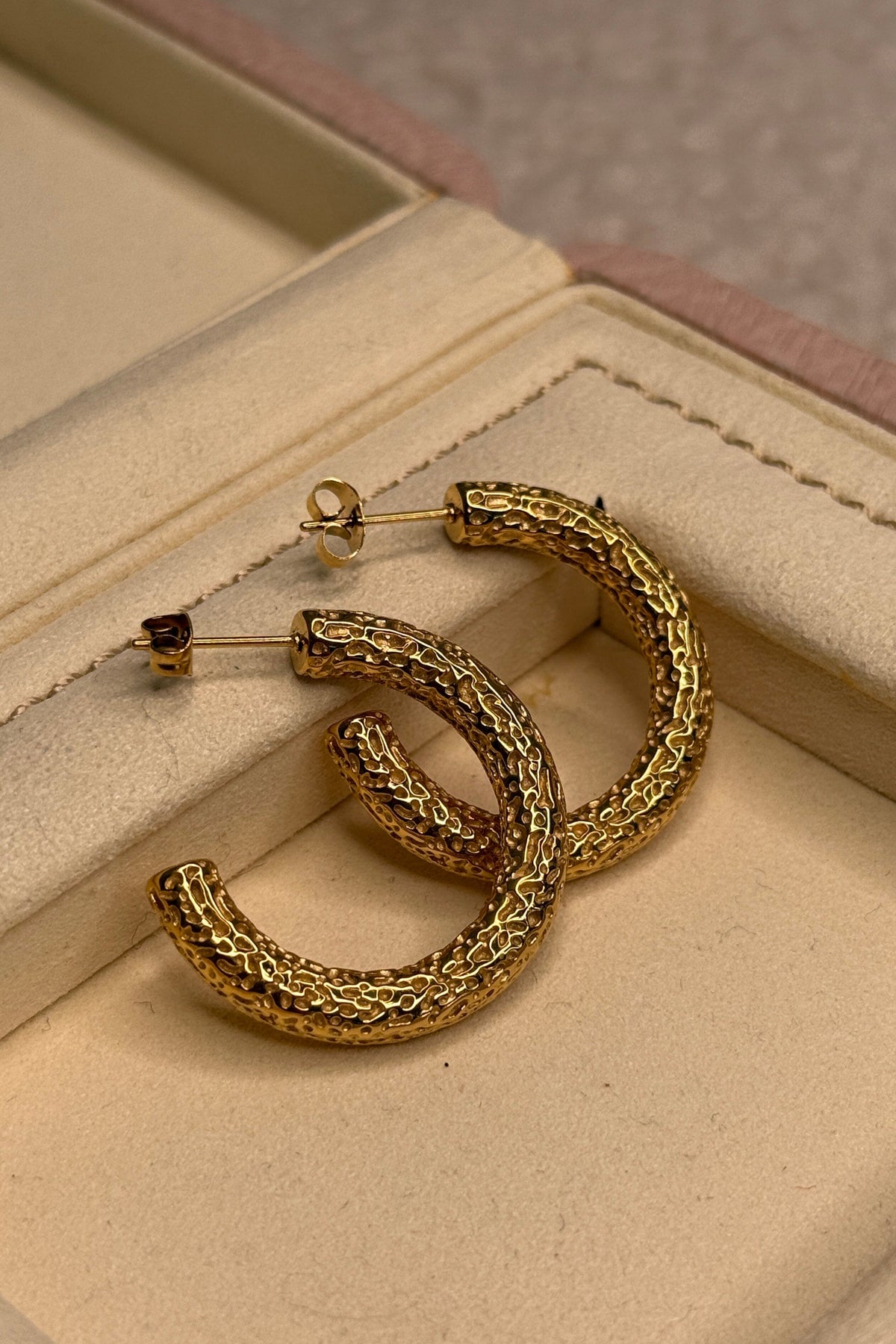 Vergulde hoops van Mellow Moon met een gestippelde oppervlakte. De oorbellen hebben een klassiek hoop-design in middelgrote maat dat bij veel verschillende gelegenheden past.