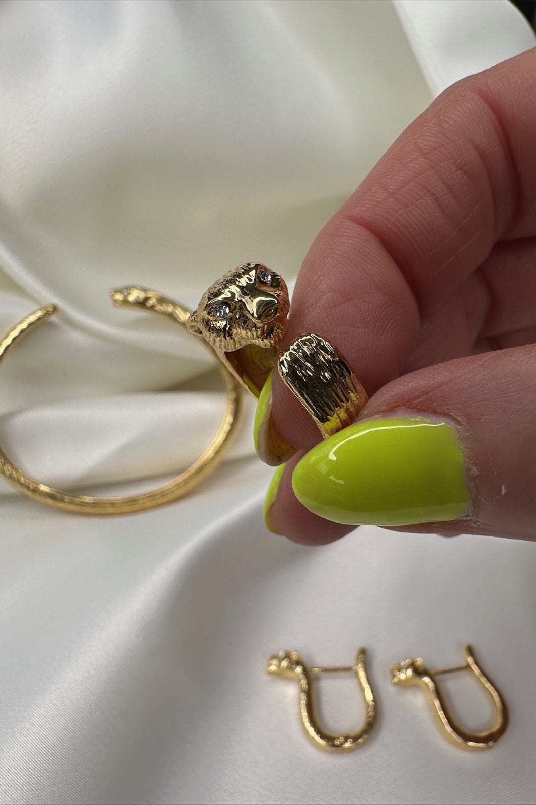 Vergulde ring van Mellow Moon met een gedetailleerd leeuwenhoofd. De ring heeft een kleine edelsteen als oog en is gemaakt van roestvrij staal met een gouden afwerking.