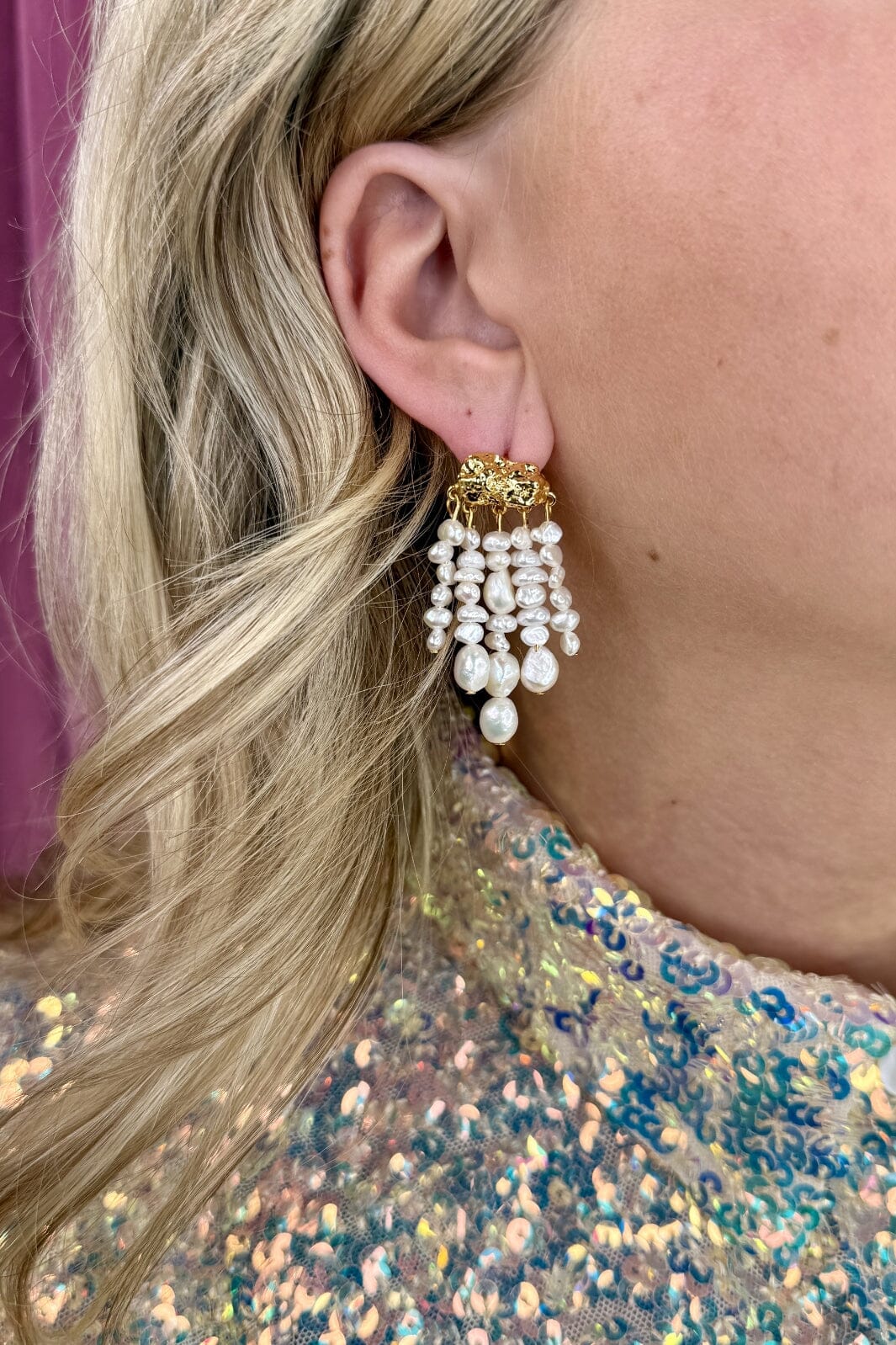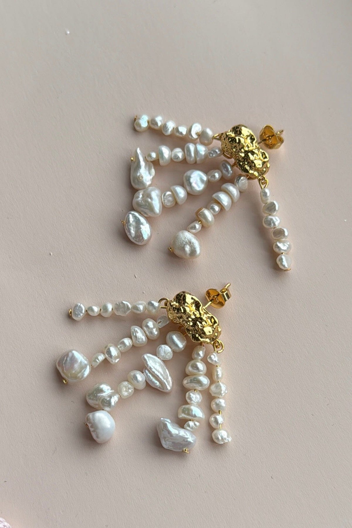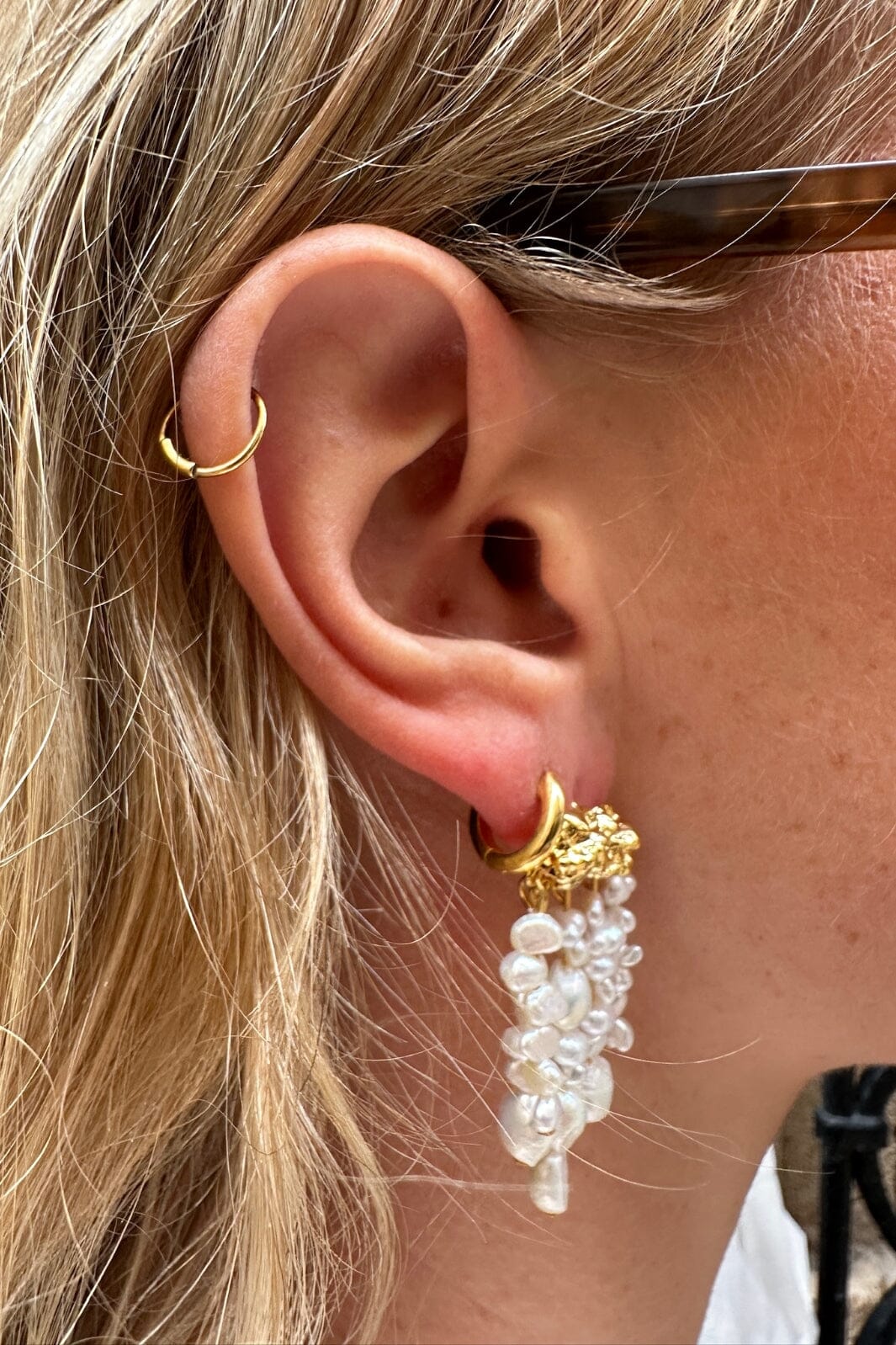 Vergulde oorbellen van Mellow Moon met vijf rijen parels in verschillende maten. De gouden bovenkant wordt gecombineerd met witte en crèmekleurige parels die een fijne beweging creëren.