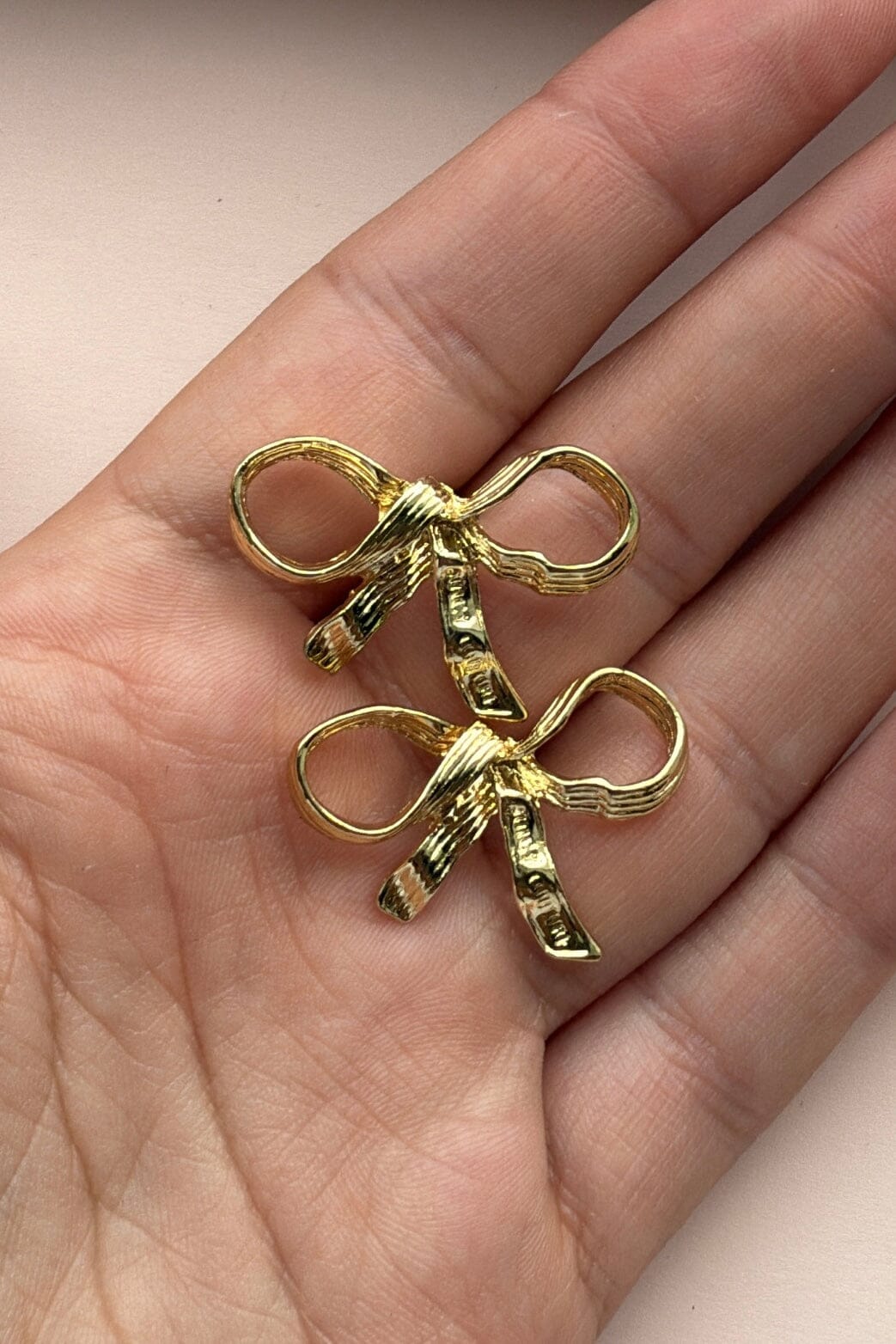 Strikvormige oorbellen van Mellow Moon met een gouden afwerking. De kleine strikken hebben een gedetailleerde textuur en een fijne vormgeving die zowel voor dagelijks gebruik als voor feesten kan worden gedragen.