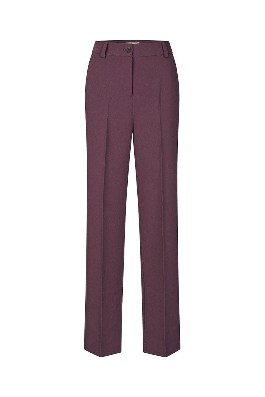 Broeken van Modström in een diepe paarse tint. Ze hebben rechte, wijde pijpen met persplooien en een losse pasvorm die veel bewegingsvrijheid biedt.