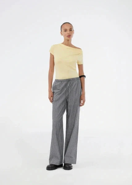 Geel T-shirt van Modström met een gedrapeerde halslijn. De T-shirt heeft korte mouwen en een aangesloten pasvorm.