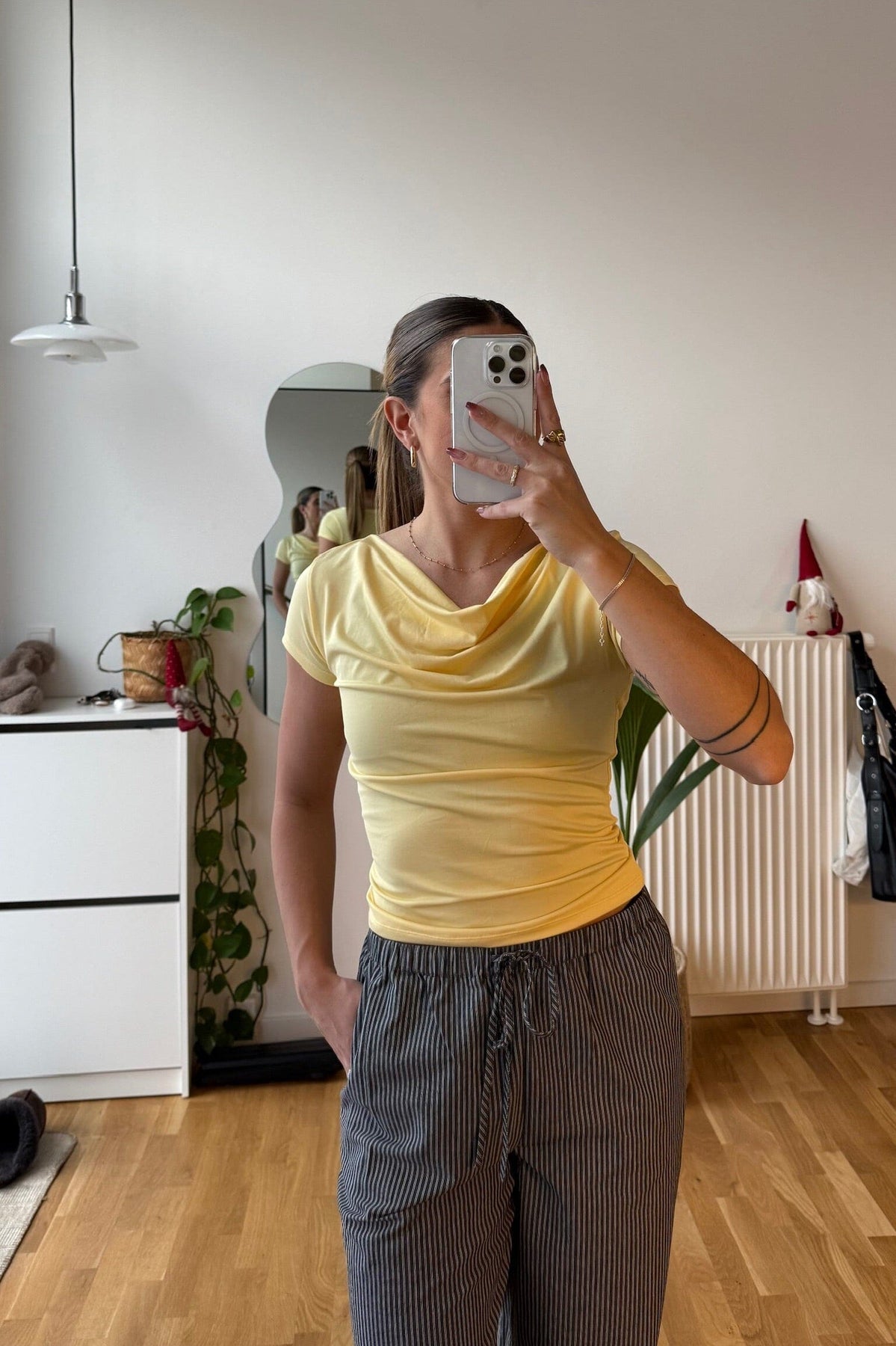 Geel T-shirt van Modström met een gedrapeerde halslijn. De T-shirt heeft korte mouwen en een aangesloten pasvorm.